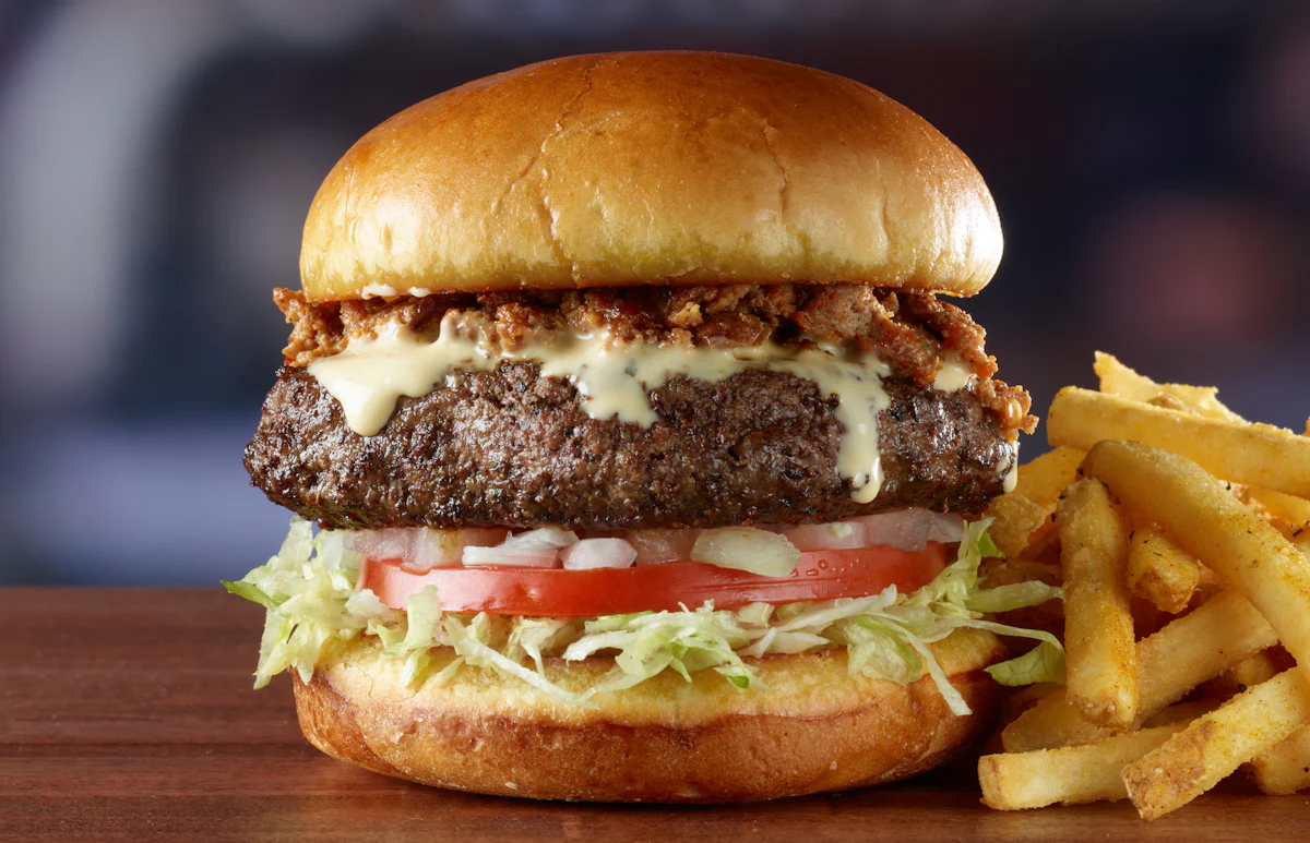 Two Bubba’s signature beef and bacon grind patties (half pound total weight) pressed and stacked. Topped with Bubba sauce, American cheese, bacon, lettuce, tomato and onion. Served juicy medium-well on a toasted bun with your choice of seasoned fries or fire fries, and a pickle spear. Substitute onion rings or a side salad for fries for $1.99. Lettuce instead of bun is available on request.