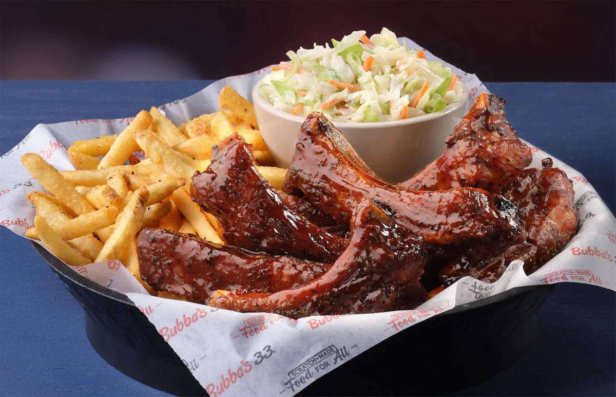 Tender baby back ribs seasoned with our house-made dry rub, cooked low and slow then fried crispy and tossed in your choice of Honey Chipotle BBQ or dry seasoning. Served with two sides.