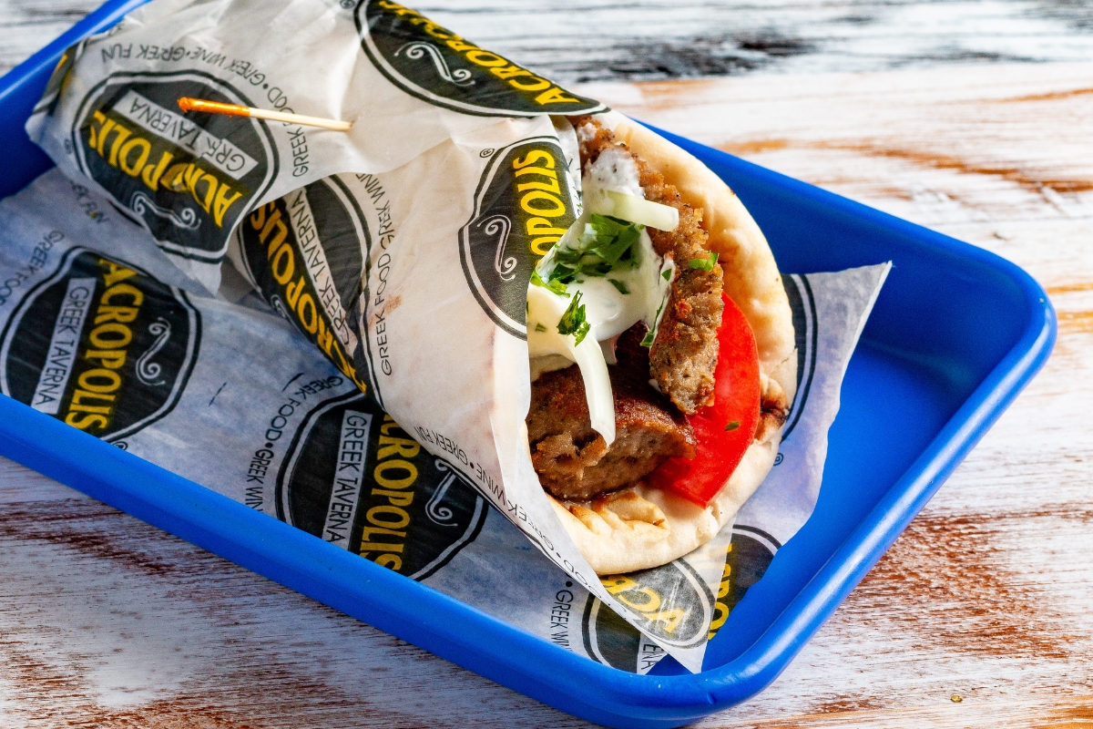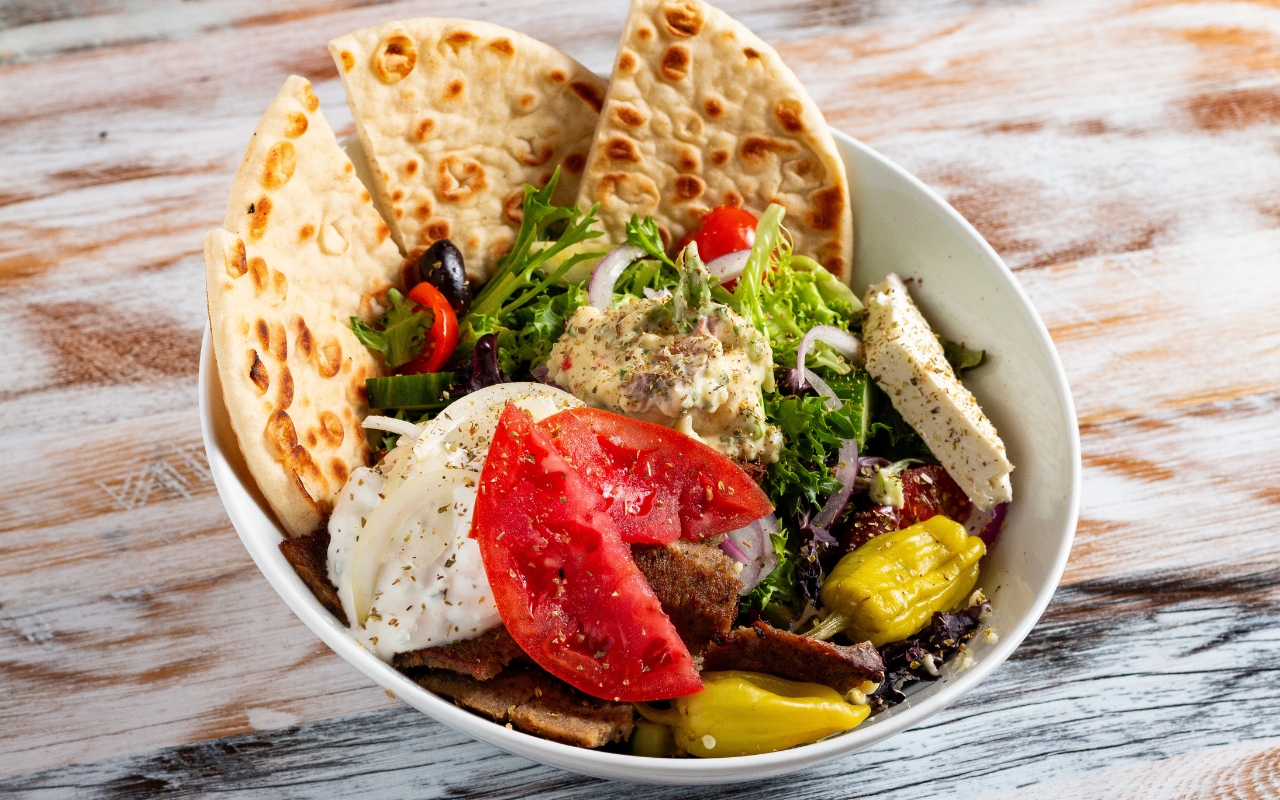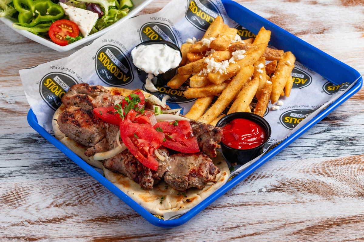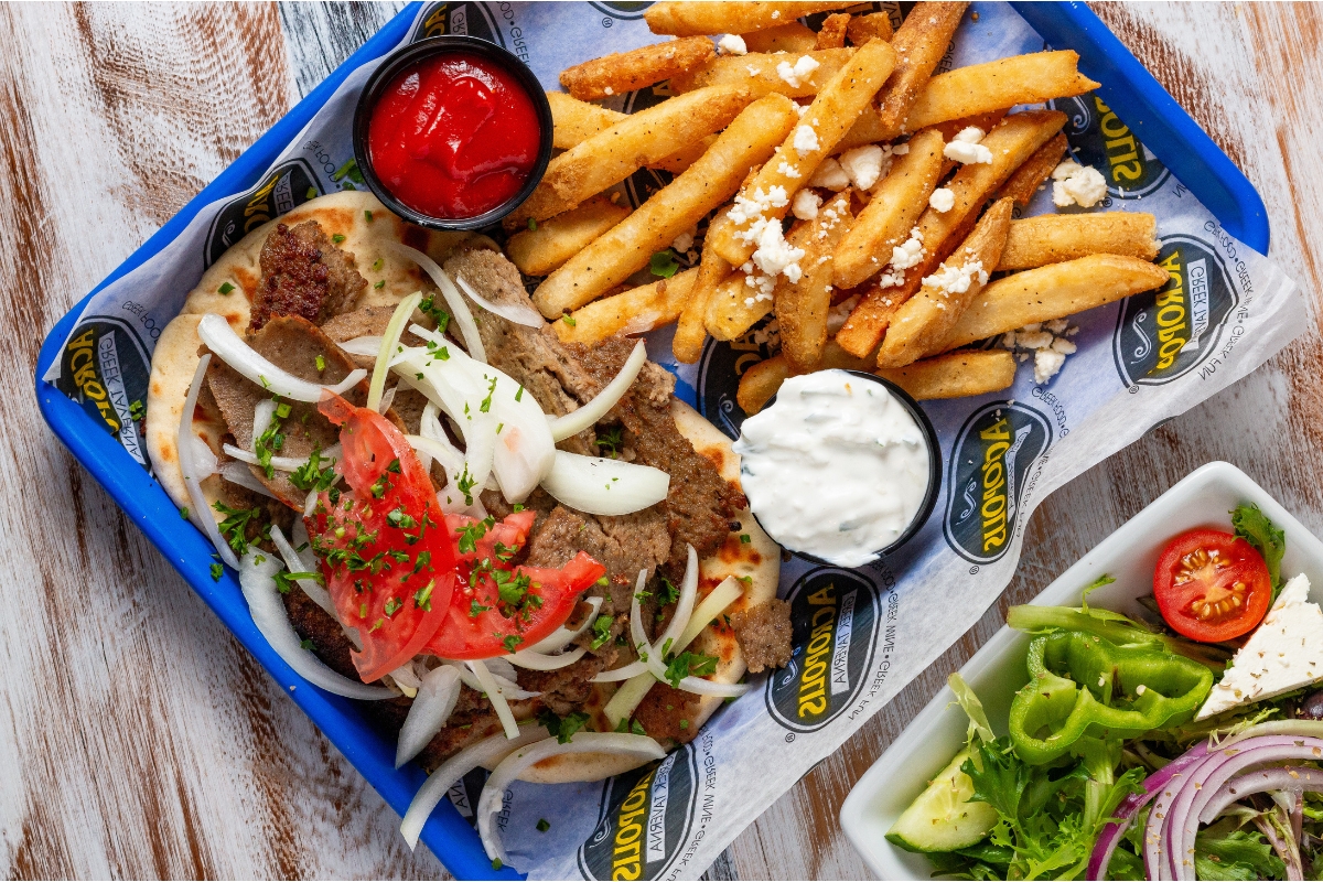 Thinly sliced spiced lamb and beef topped with tomatoes, onions, and tzatziki sauce over pita. Served with Greek fries and a side Greek salad.