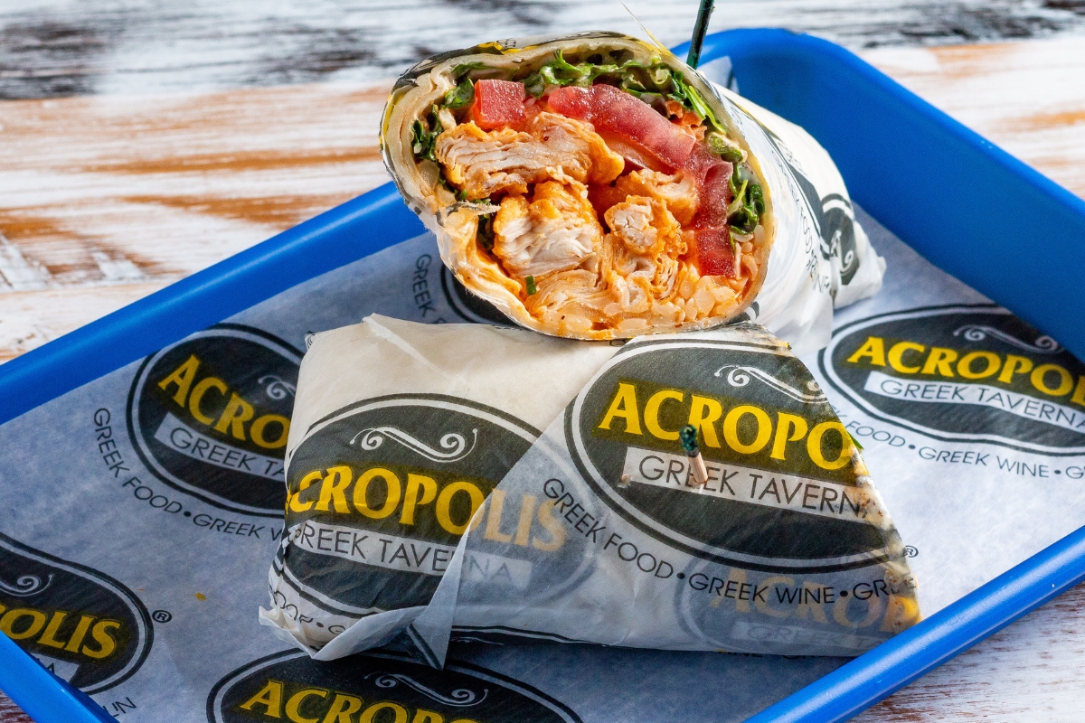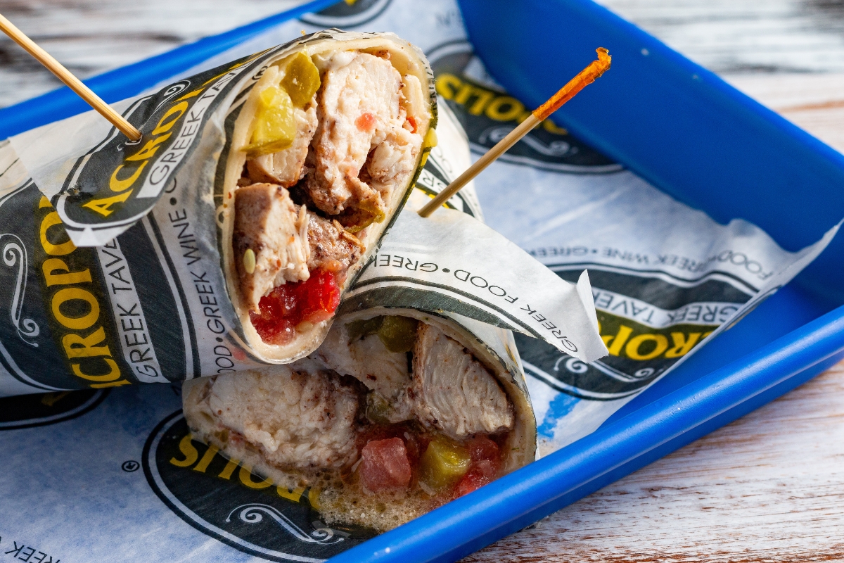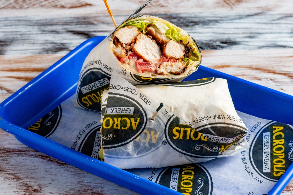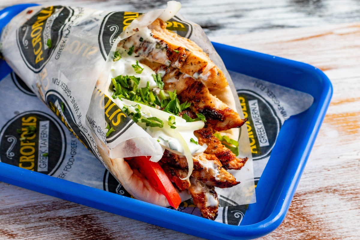 Seasoned grilled chicken topped with tomatoes, onions, tzatziki sauce wrapped in fresh pita.