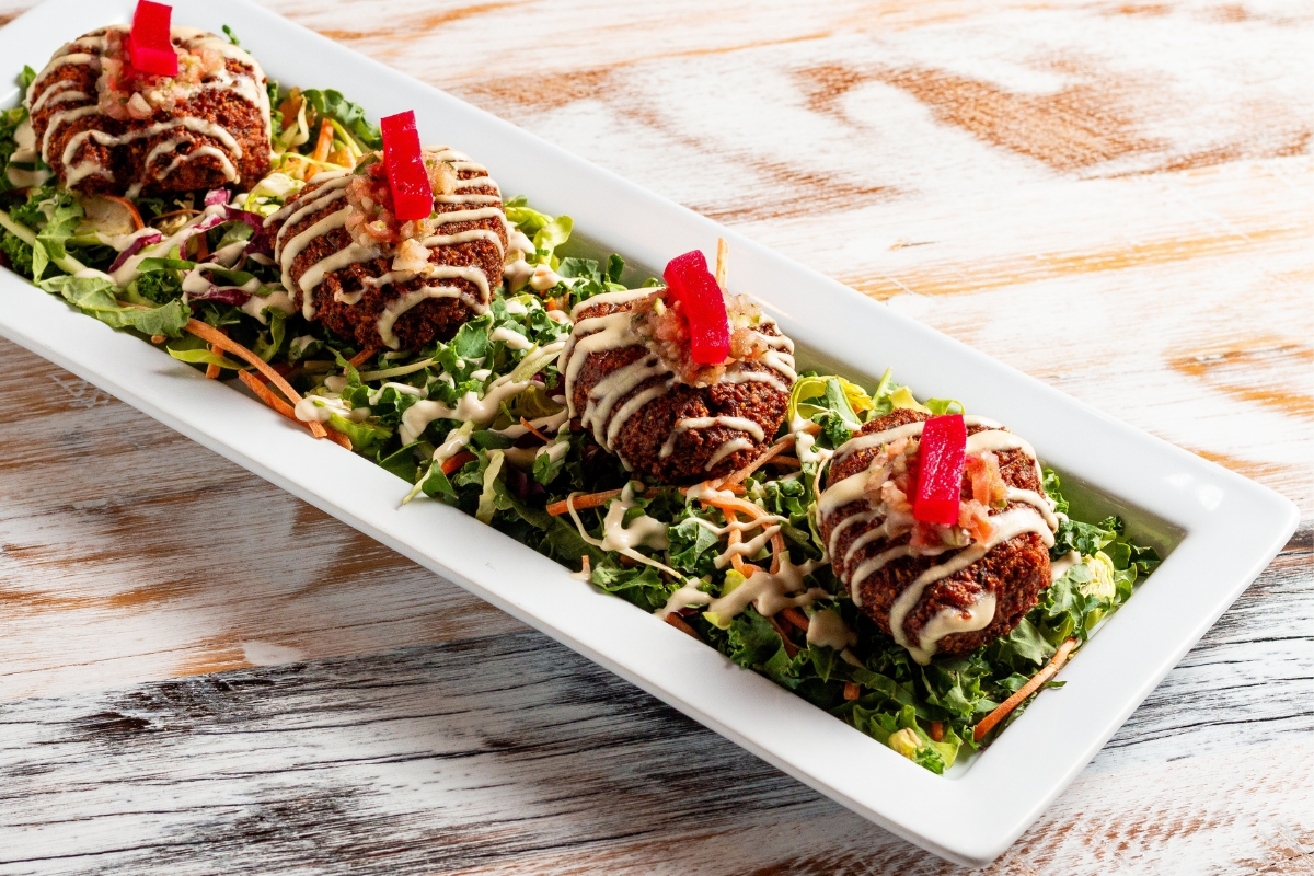 Spiced chickpeas and sesame, lightly fried. Served with tahini, vegetable slaw, pickled turnips, and mediterranean salsa.