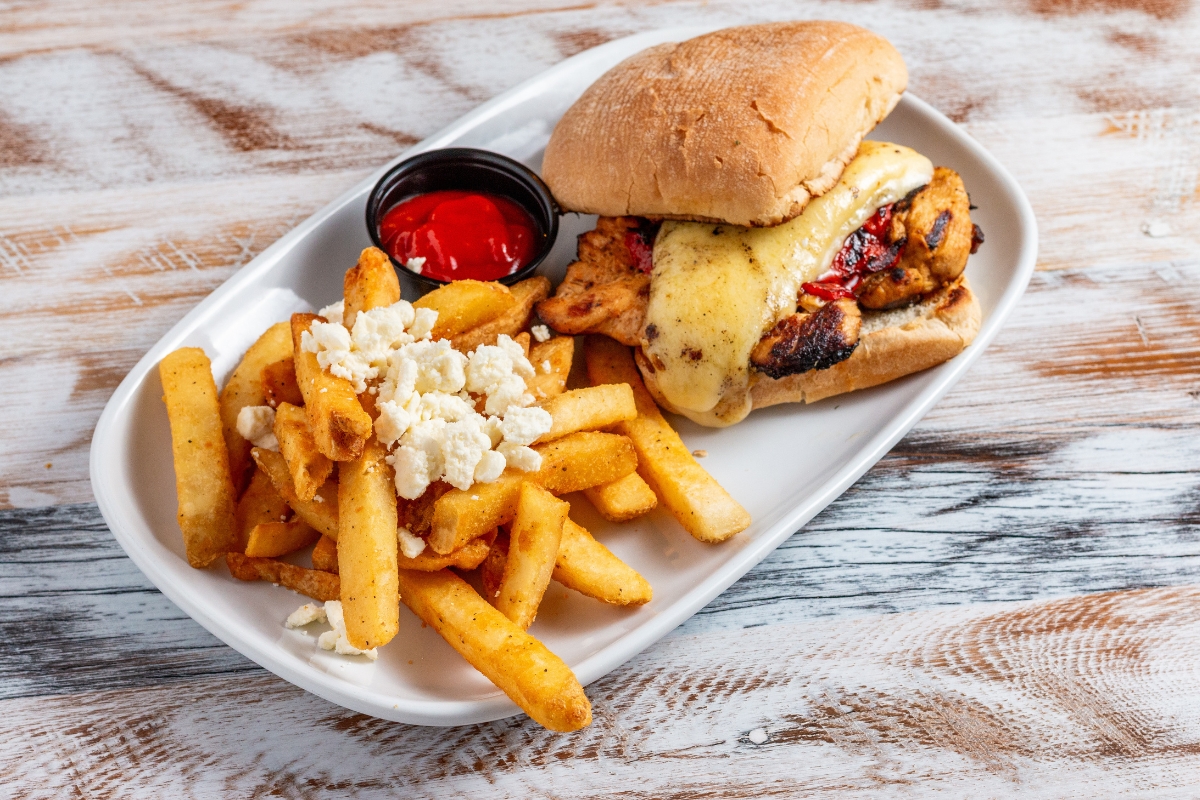 Char grilled chicken breast topped with roasted red pepper, kefalograviera cheese and garlic dill aioli served on ciabatta bread. Served with Greek fries.