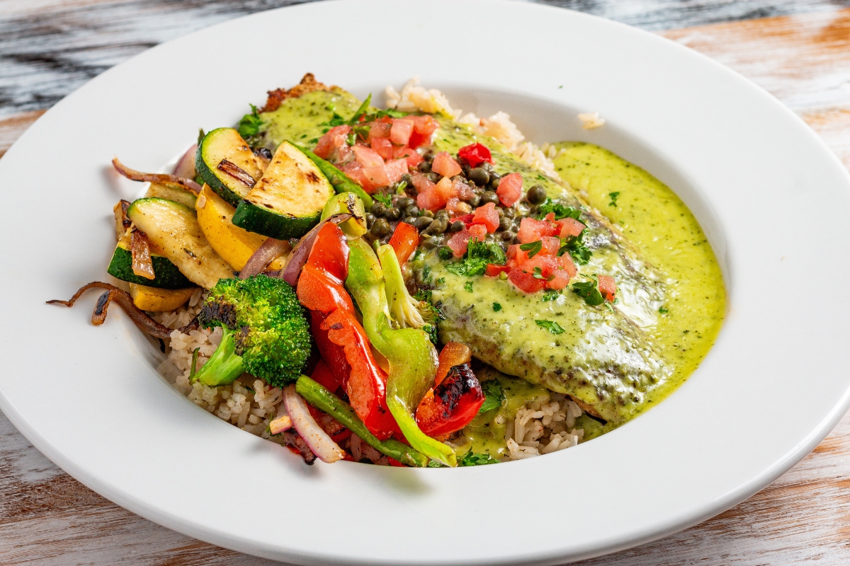 Lightly breaded fish filet topped with pesto and Santorini sauce over Greek rice. Served with roasted vegetables.