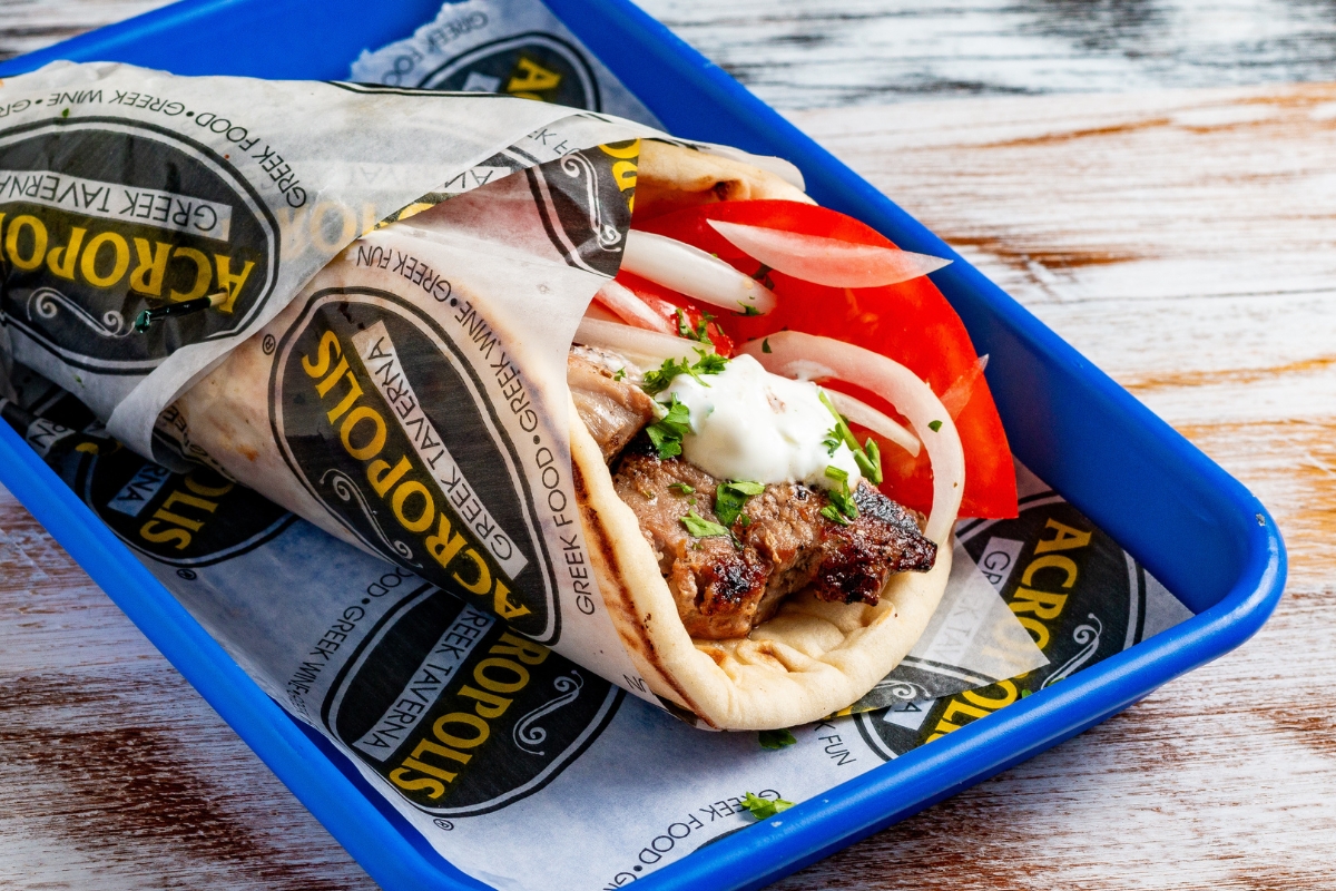 Marinated pork tenderloin topped with tomatoes, onions, tzatziki sauce wrapped in fresh pita.