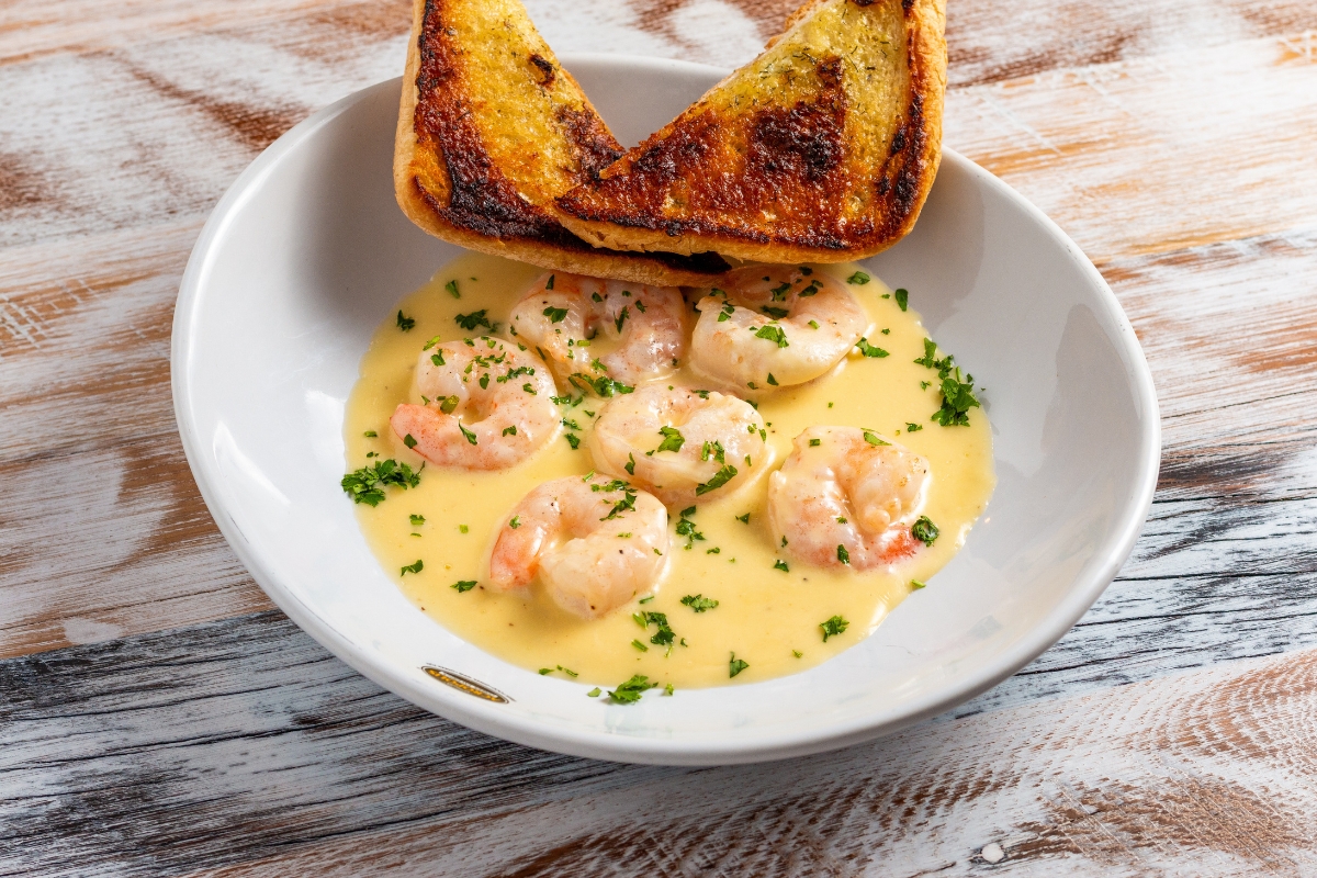 Sautéed Shrimp in a Santorini lemon garlic wine sauce topped with shaved Parmesan cheese. Served with garlic bread.