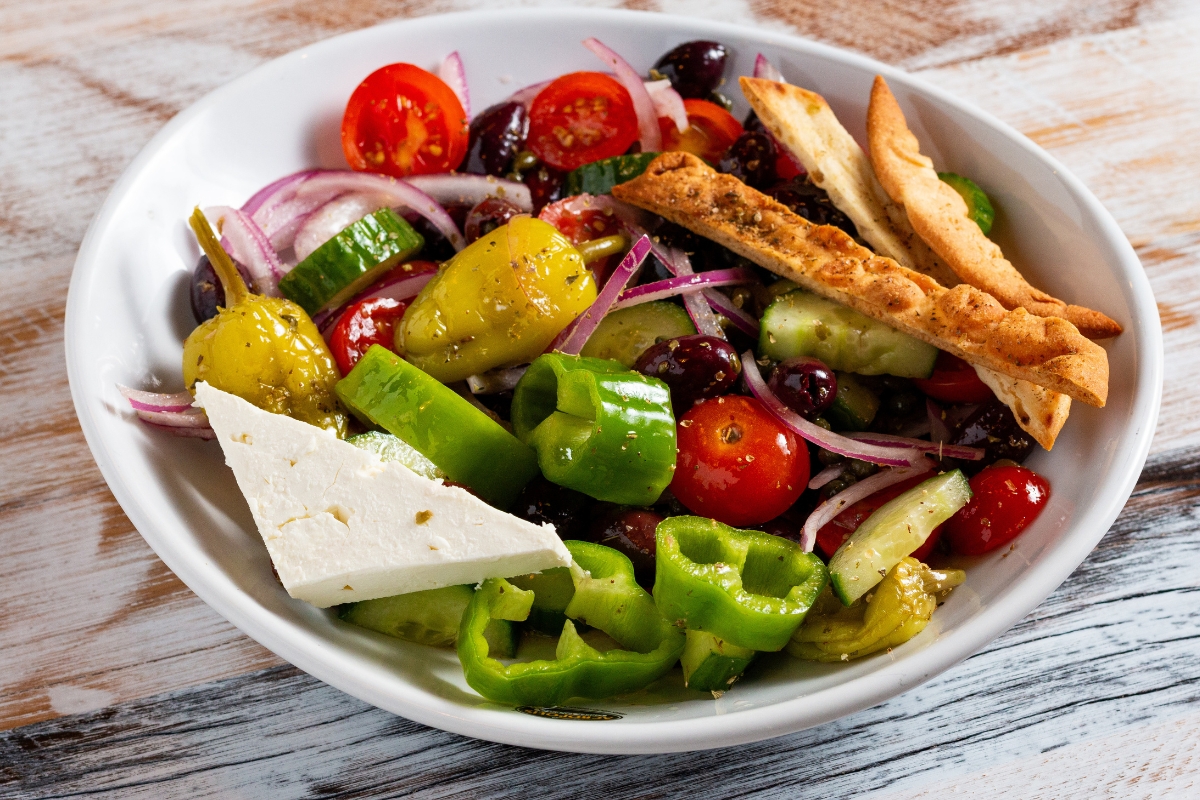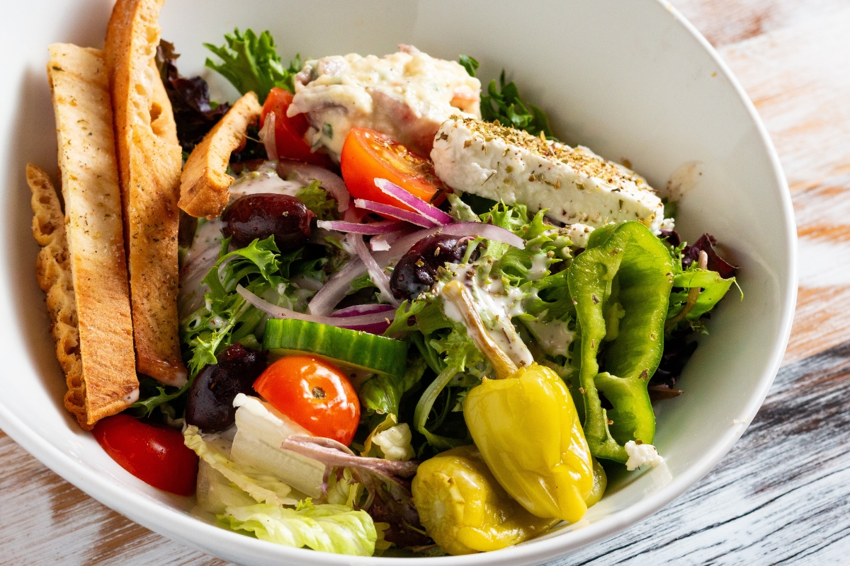 Traditional greek village salad with cucumbers, tomatoes, onions, pepperoncini, capers, kalamata olives, green pepper and fresh oregano. Drizzled with extra virgin olive oil and red wine vinaigrette. Topped with feta cheese and toasted pita strips.