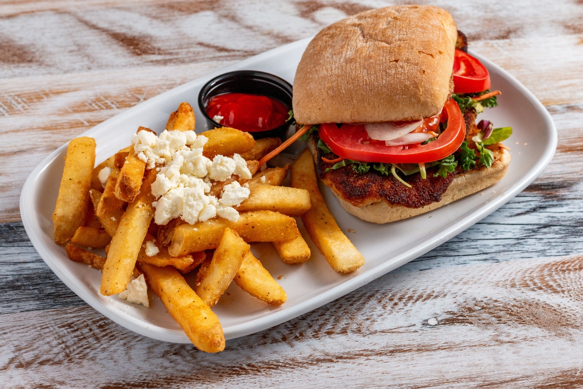 Lightly breaded fish filet topped with mixed vegetable slaw, pesto, garlic dill aioli, tomatoes and onions on ciabatta bread. Served with Greek fries.