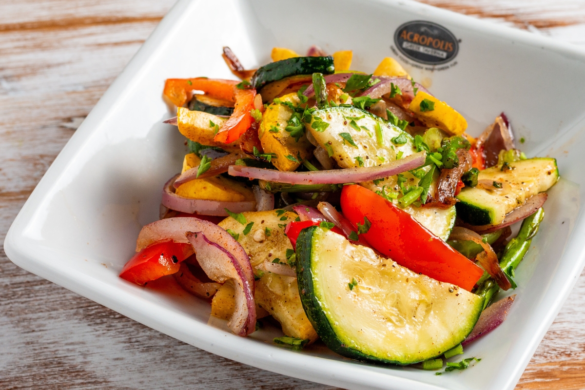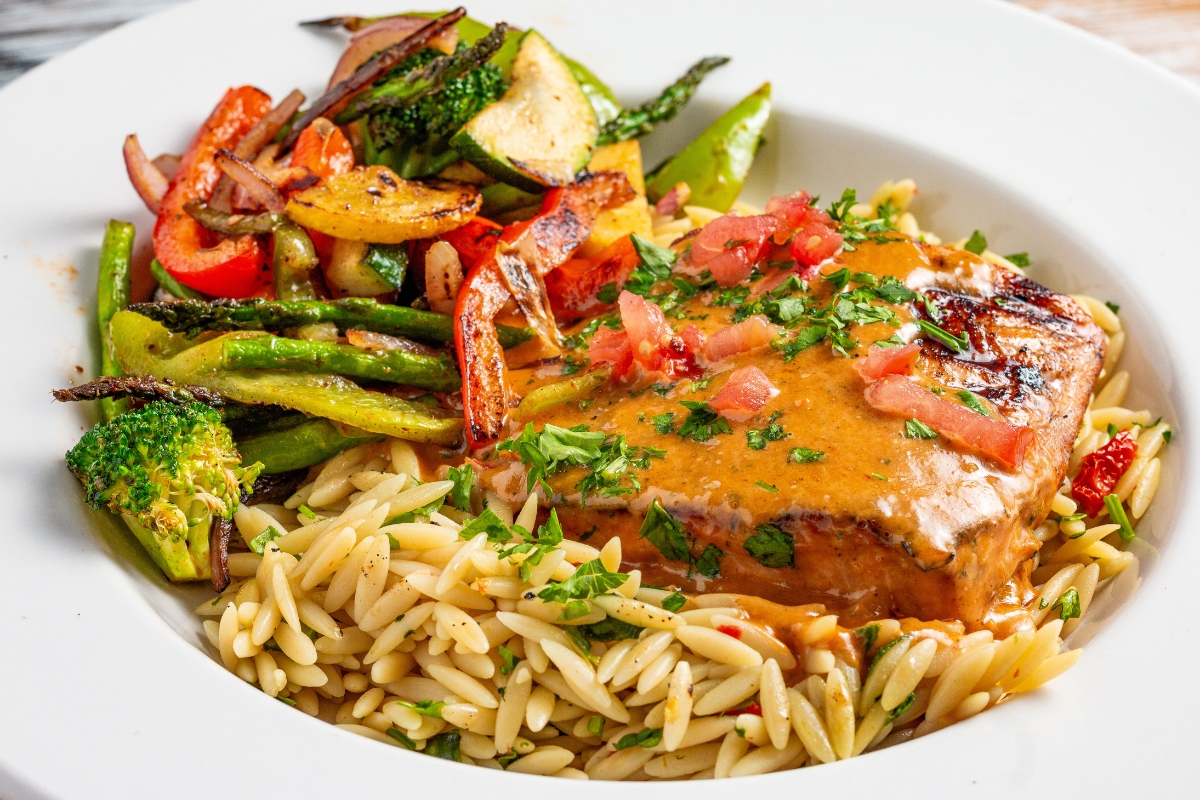 Char broiled wild-caught salmon over mediterranean orzo topped with Acropolis signature roasted red pepper sauce, cherry tomatoes and onions. Served with roasted vegetables.