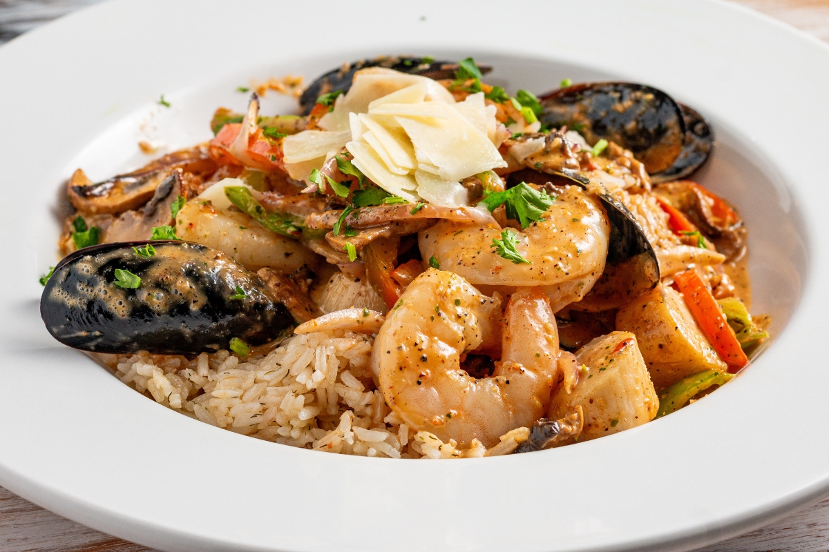 Sautéed shrimp, mussels, scallops, mushrooms, red onions and bell peppers with Acropolis signature roasted red pepper sauce over rice or penne pasta. Topped with shaved parmesan cheese.