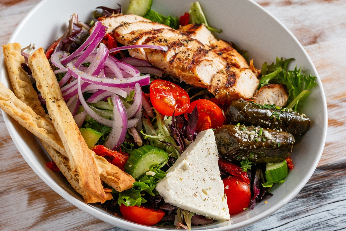 Seasoned grilled chicken breast over lettuce mix with red onion, cucumber, feta cheese, sun dried tomatoes, and dolmades. Topped with toasted pita strips and served with Acropolis homemade Greek dressing.