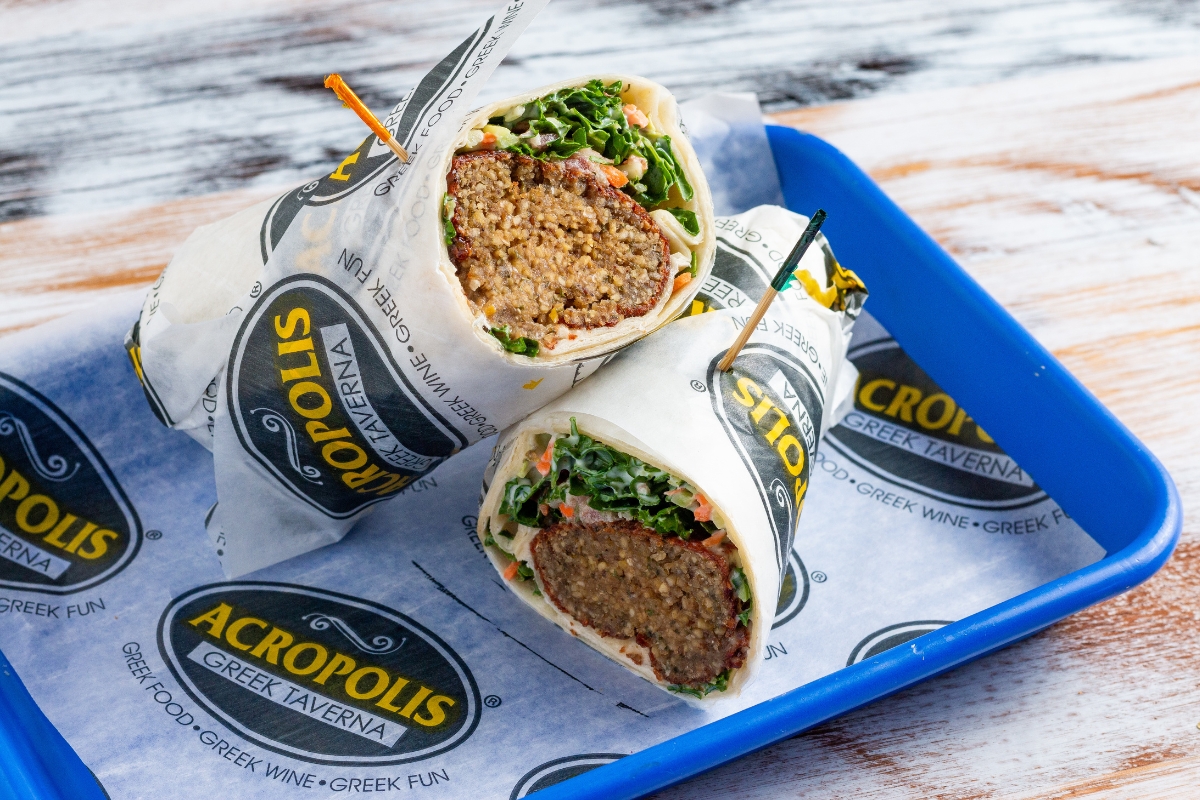 Lightly breaded chickpeas with lettuce, mediterranean salsa, tahini and pickles wrapped in a tortilla.
