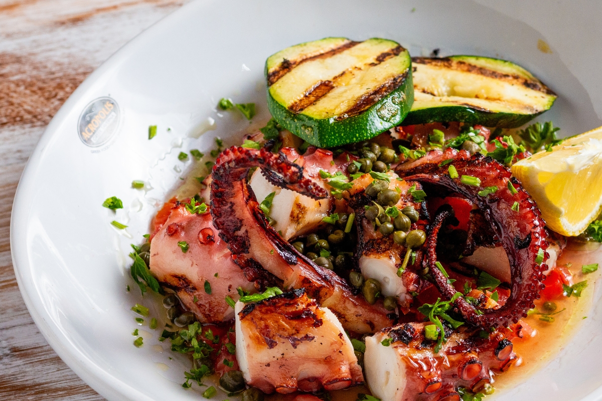 Grilled octopus marinated in lemon and olive oil vinaigrette with fresh garlic, capers and diced tomato.
