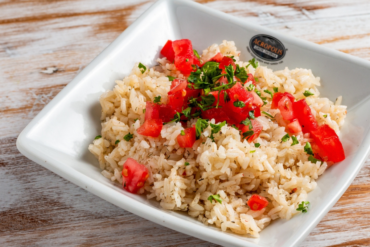 Premium chicken breast with green peppers, onions and cherry tomatoes served over Greek rice.