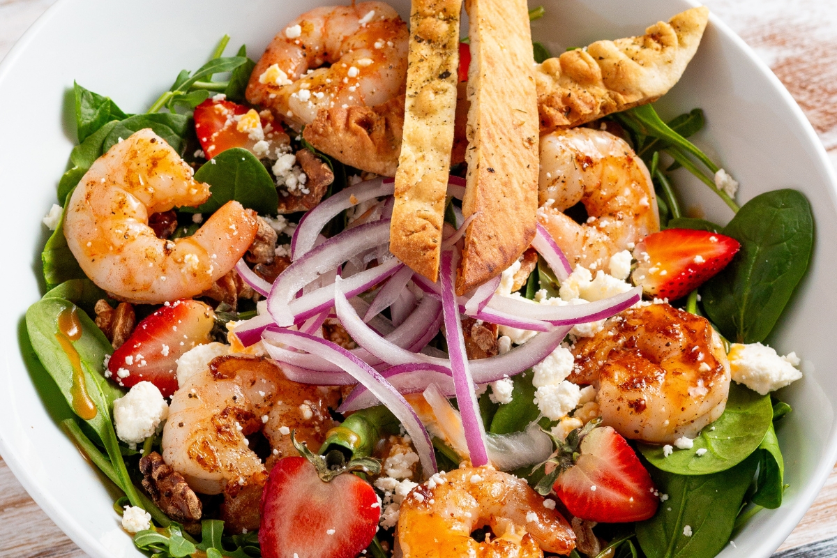 Blackend shrimp over a bed of fresh arugula and spinach tossed with candied walnuts, red onion and blood orange vinaigrette and topped with feta cheese.