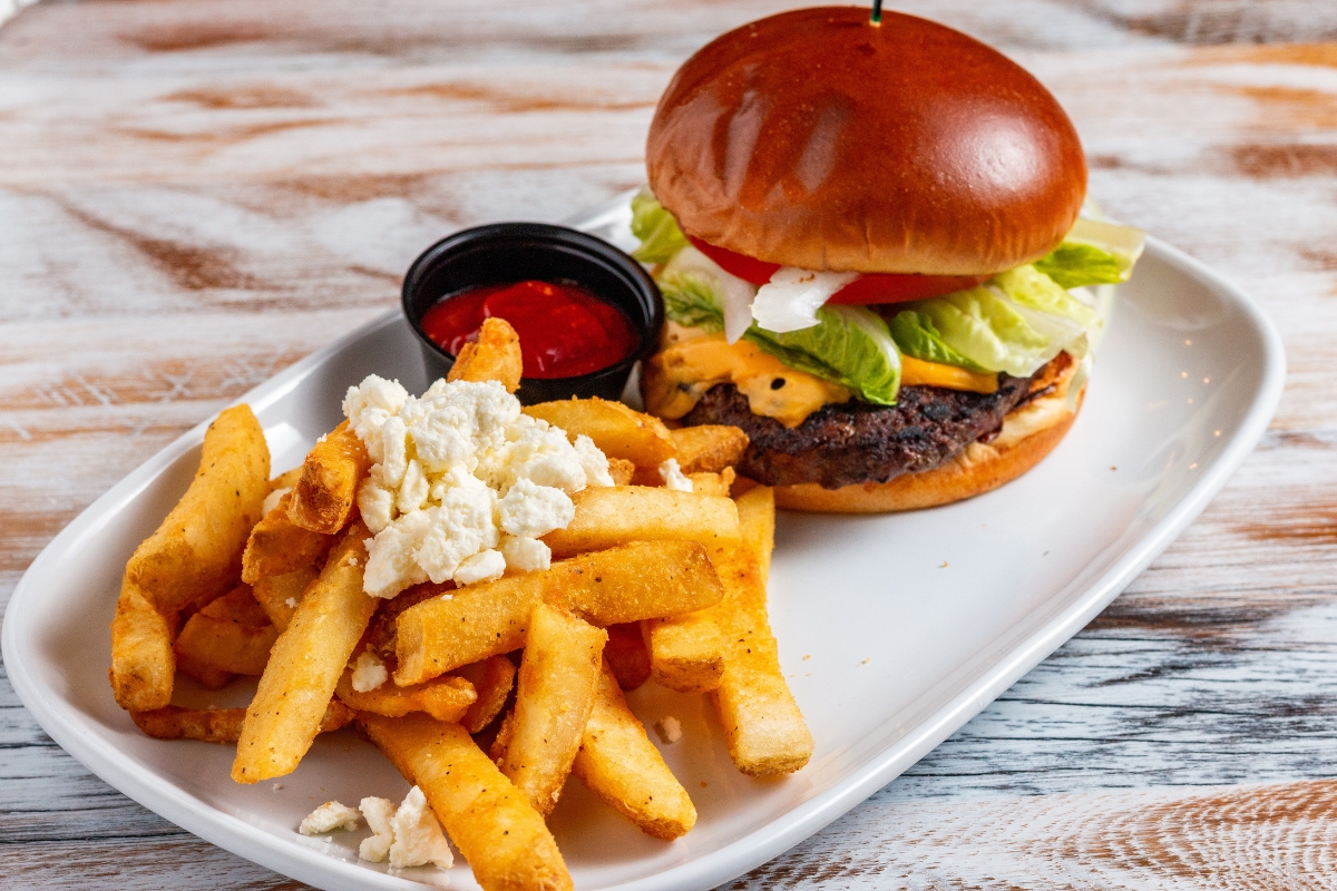 100% Angus beef patty, perfectly seasoned and topped with American cheese, lettuce, tomato, and onion. Served with Greek fries.