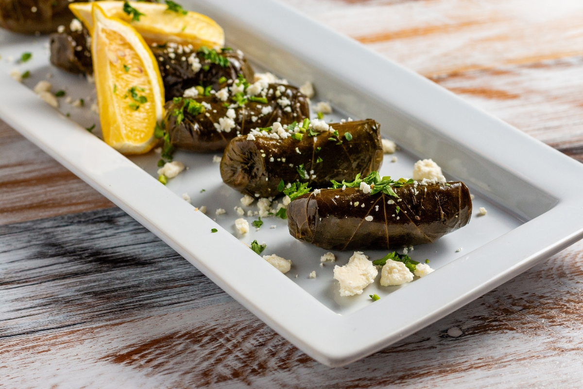Grape leaves stuffed with rice, lemon juice, olive oil and Greek herbs. Topped with feta cheese.