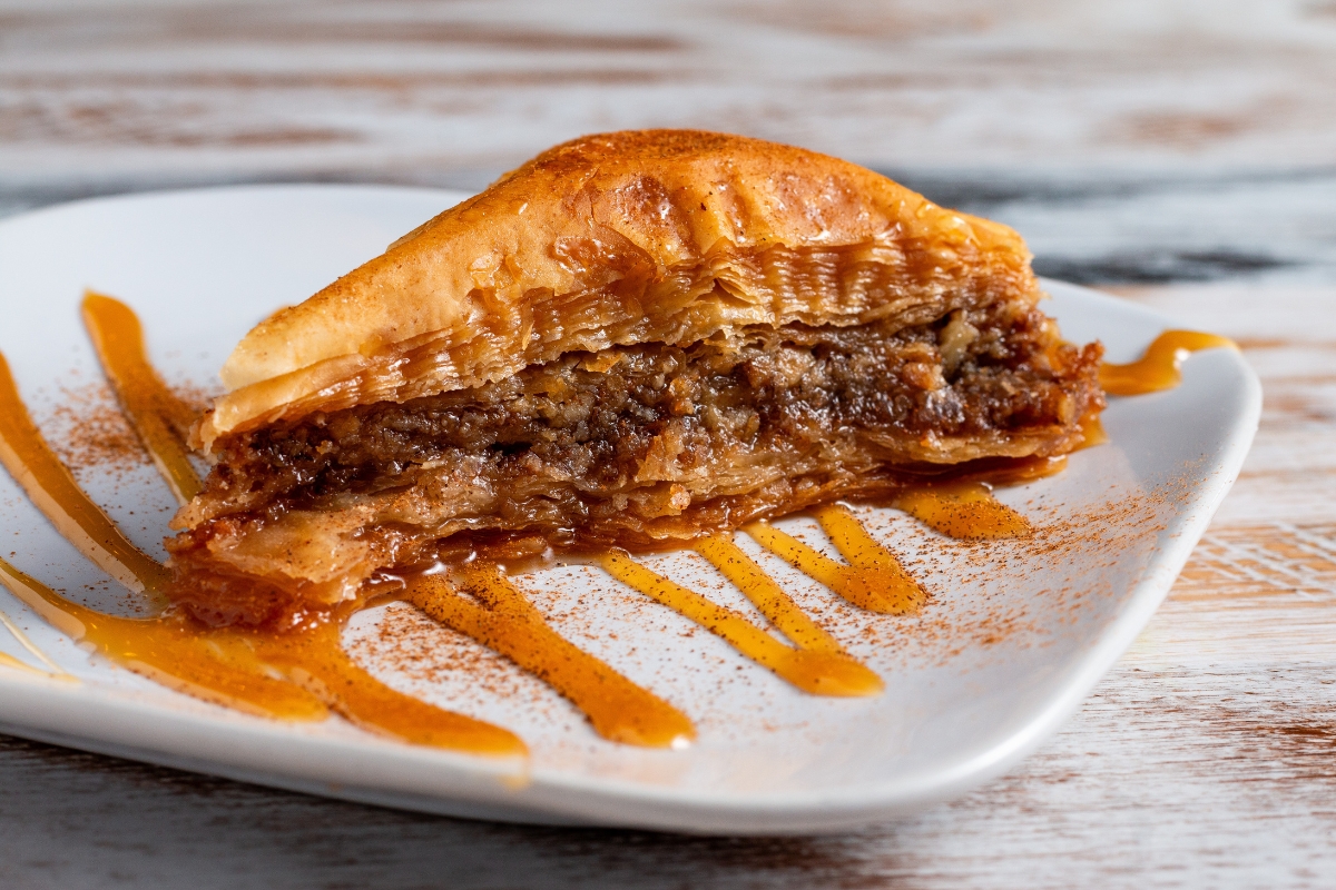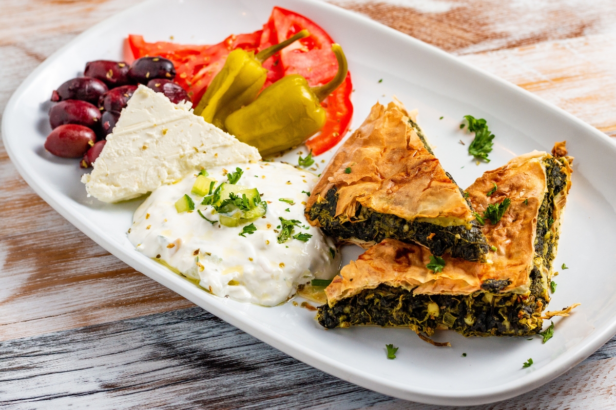 Light and flaky phyllo pastry dough stuffed with spinach and feta cheese.