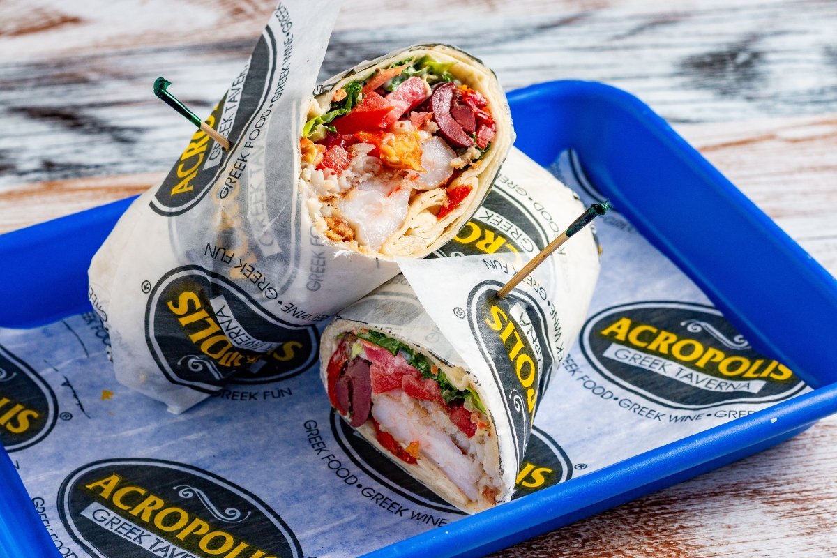Blackened shrimp and fish, olives, sun dried tomatoes, avocado, spinach, candied walnuts, mixed vegetable slaw, feta cheese and garlic dill aioli wrapped in a tortilla.