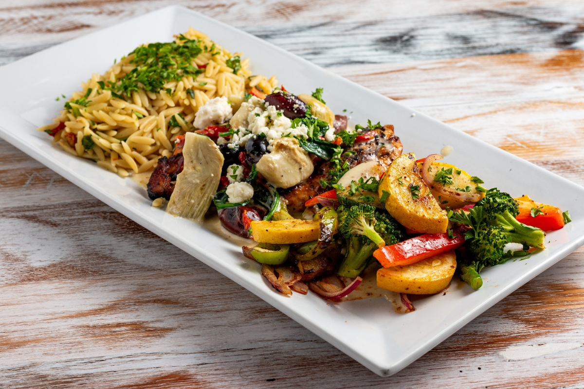 Premium grilled chicken breast in a manatari sauce, sautéed with artichokes, sun dried tomatoes, spinach and olives. Topped with crumbled feta cheese and served with orzo and roasted vegetables.