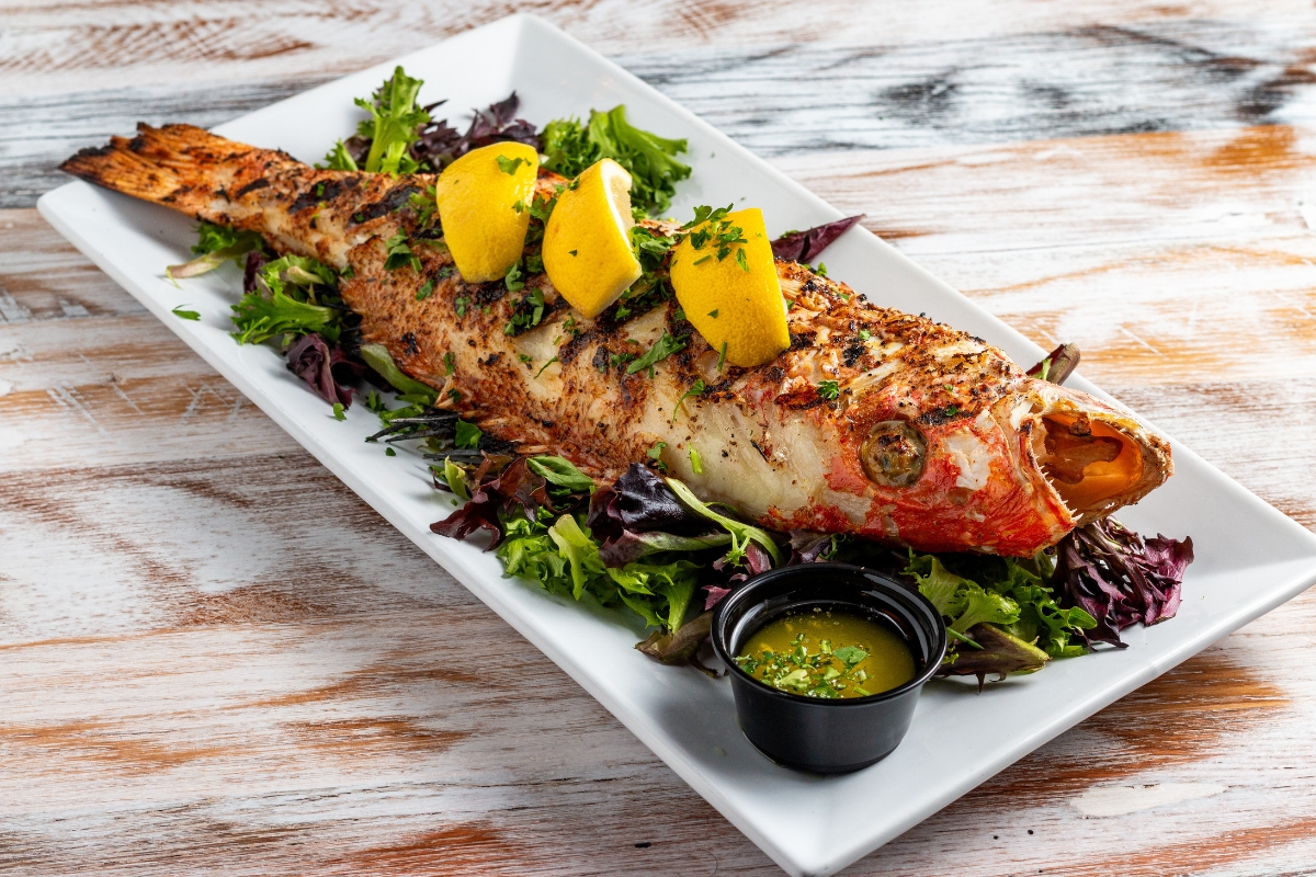 Wild-caught whole Red Snapper marinated in rosemary, garlic, extra virgin olive oil and fresh lemons char broiled or fried to perfection and topped with lemon and herbs.