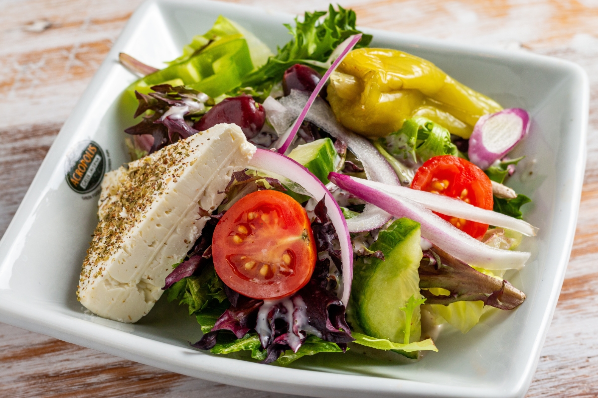 Lettuce mix, tomato, red onion, cucumber, pepperoncini and kalamata olives. Topped with feta cheese, potato salad and toasted pita strips. Served with Acropolis homemade Greek dressing.