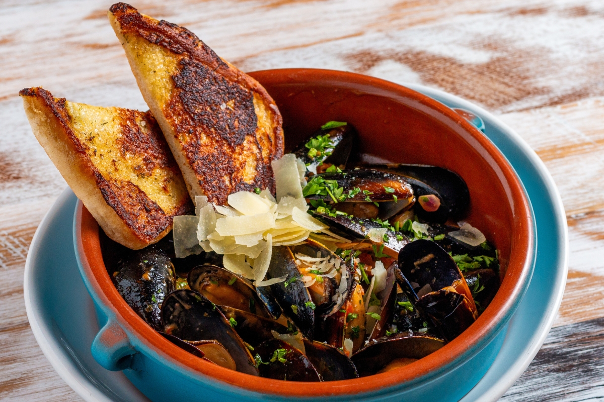 Sautéed mussels in a creamy ouzo sauce with garlic, onion, basil, and tomato. Topped with Parmesan cheese. Served with garlic bread.