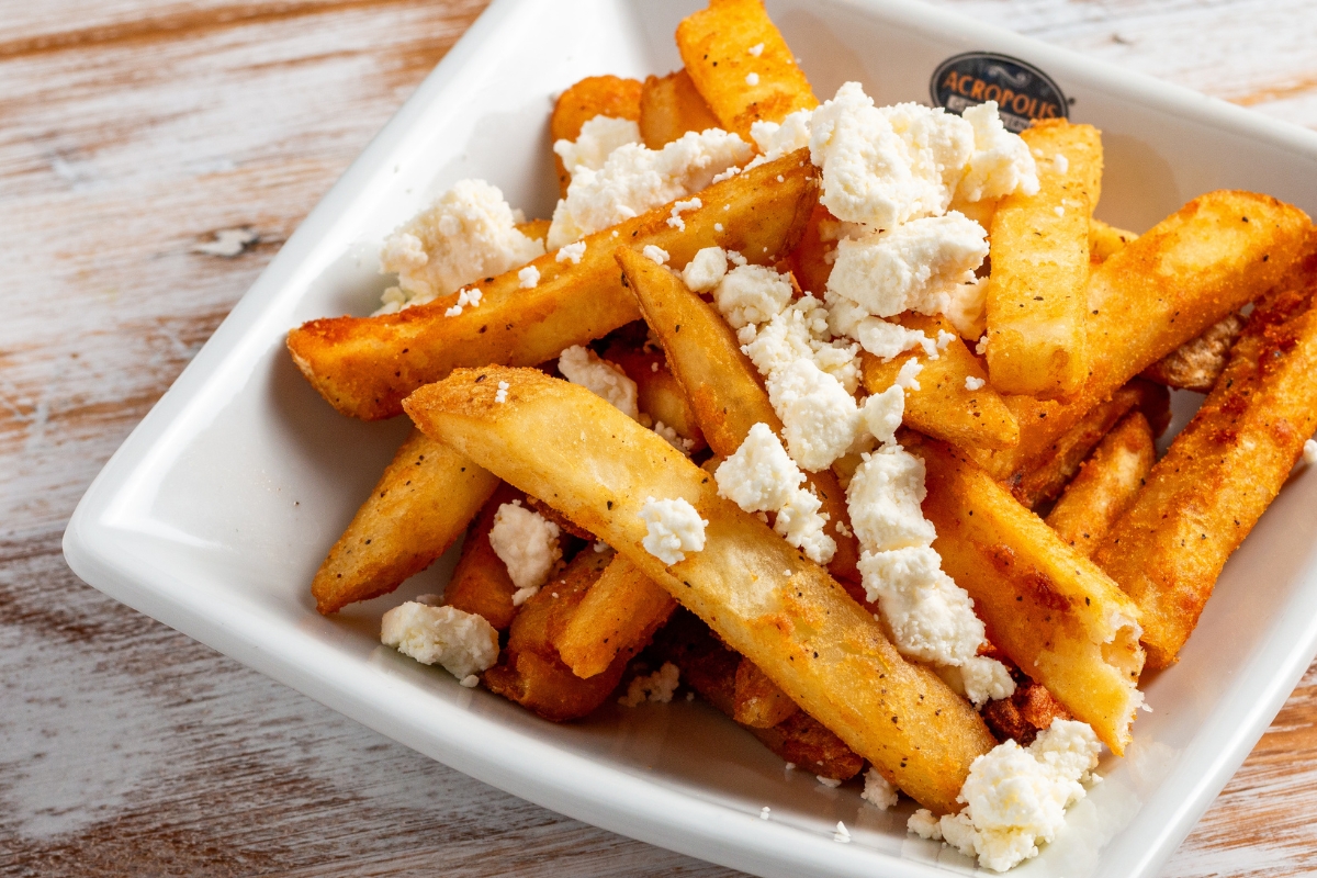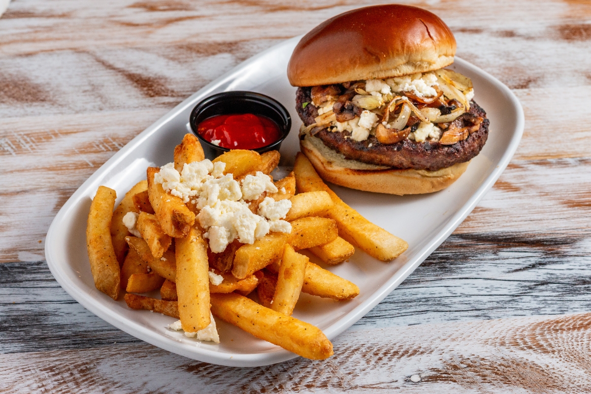 100% Angus beef patty, perfectly seasoned and topped with sautéed mushrooms, onions, and feta cheese. Served with Greek fries.