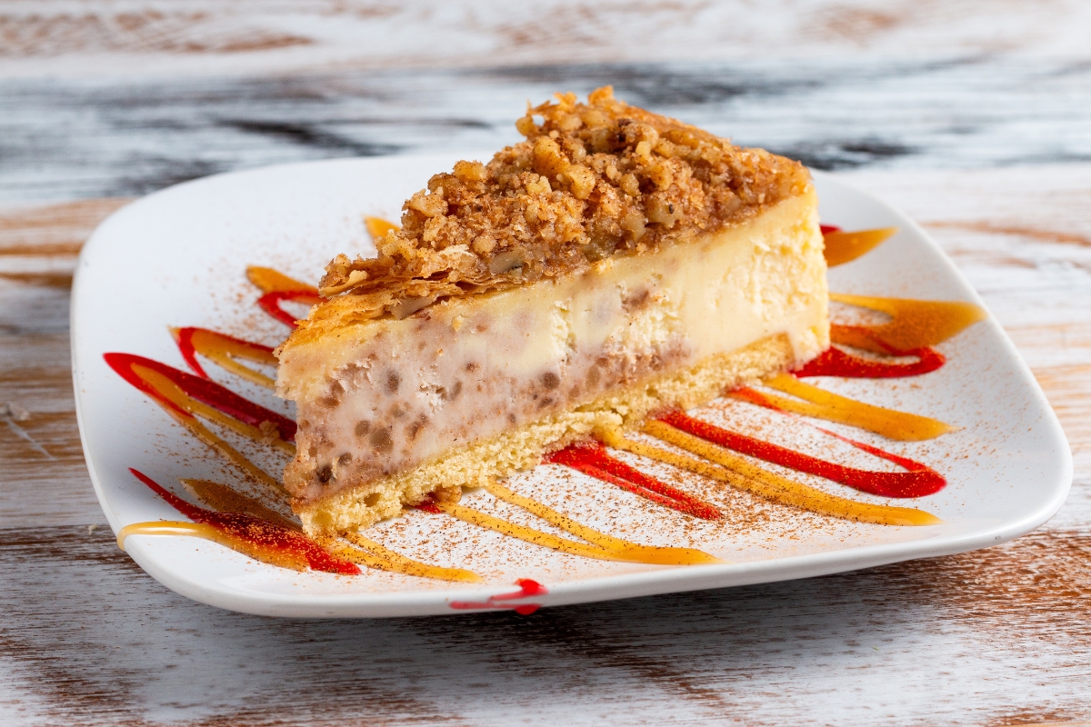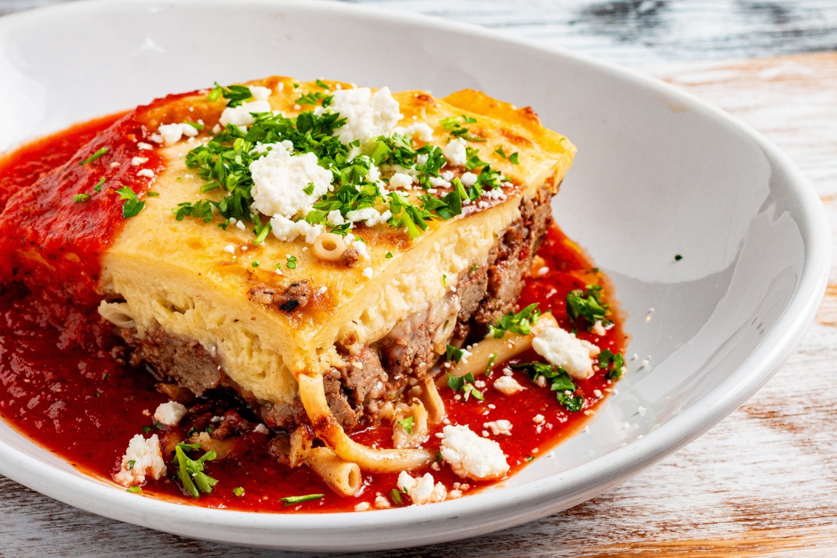 Potatoes, eggplant, ground beef & onions baked with creamy béchamel topped with tomato sauce and feta cheese.