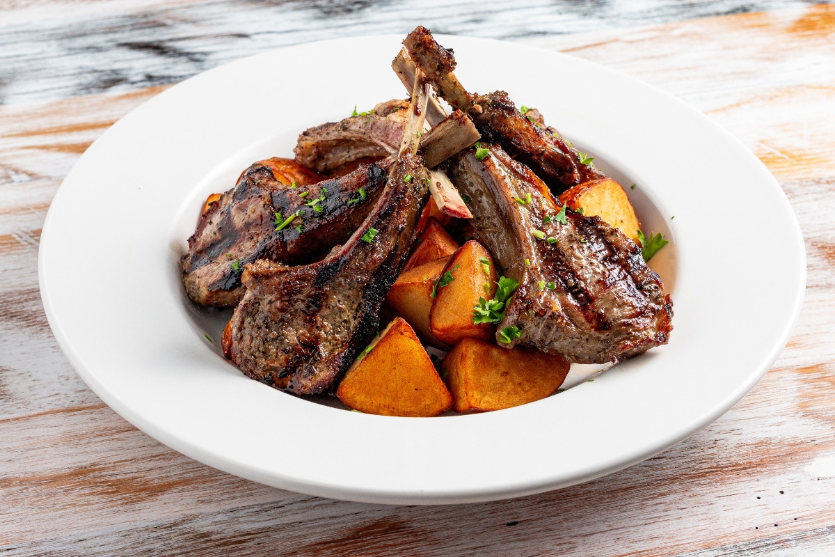 French rack of lamb, all natural antibiotic free and no added hormones cut into chops and grilled to perfection, served over Greek potatoes.