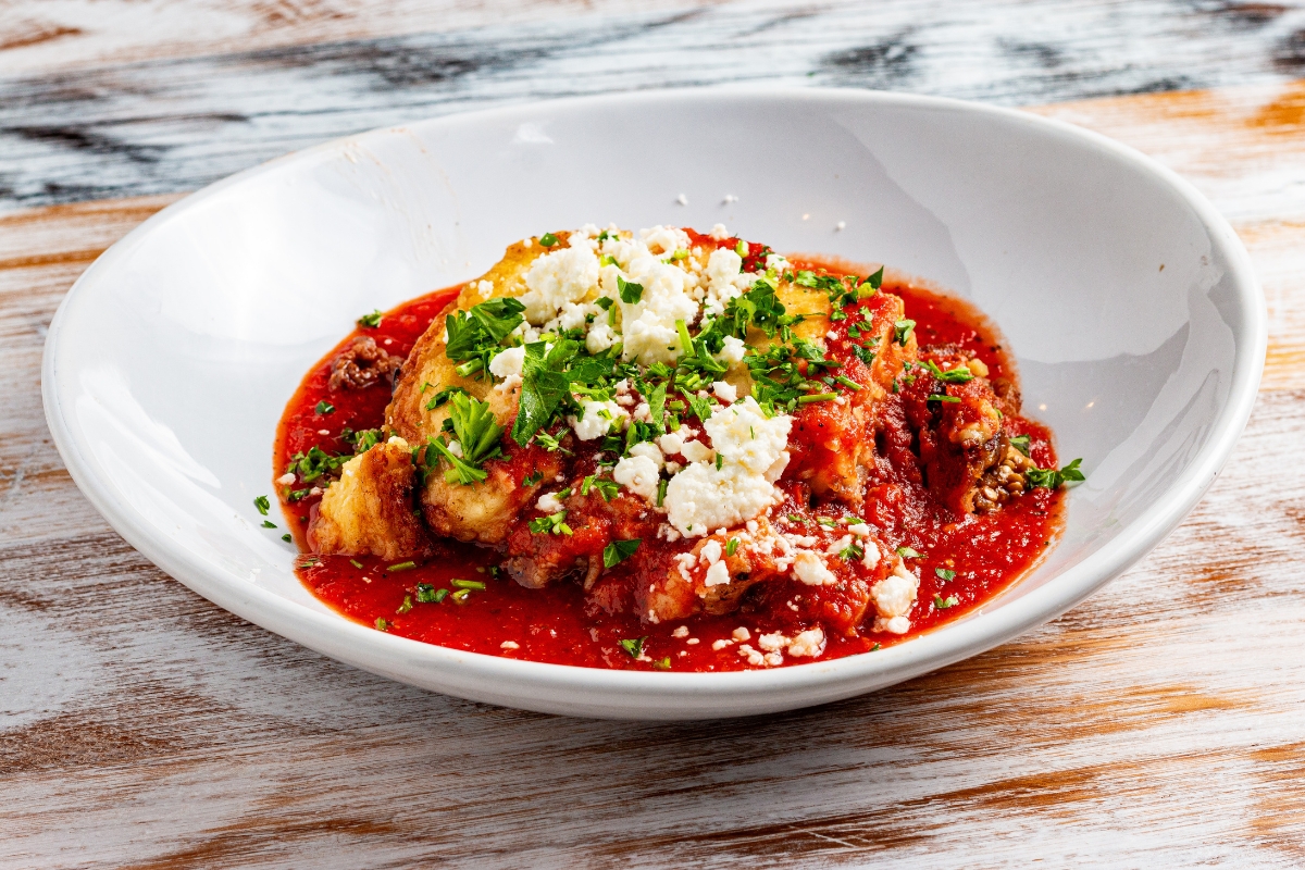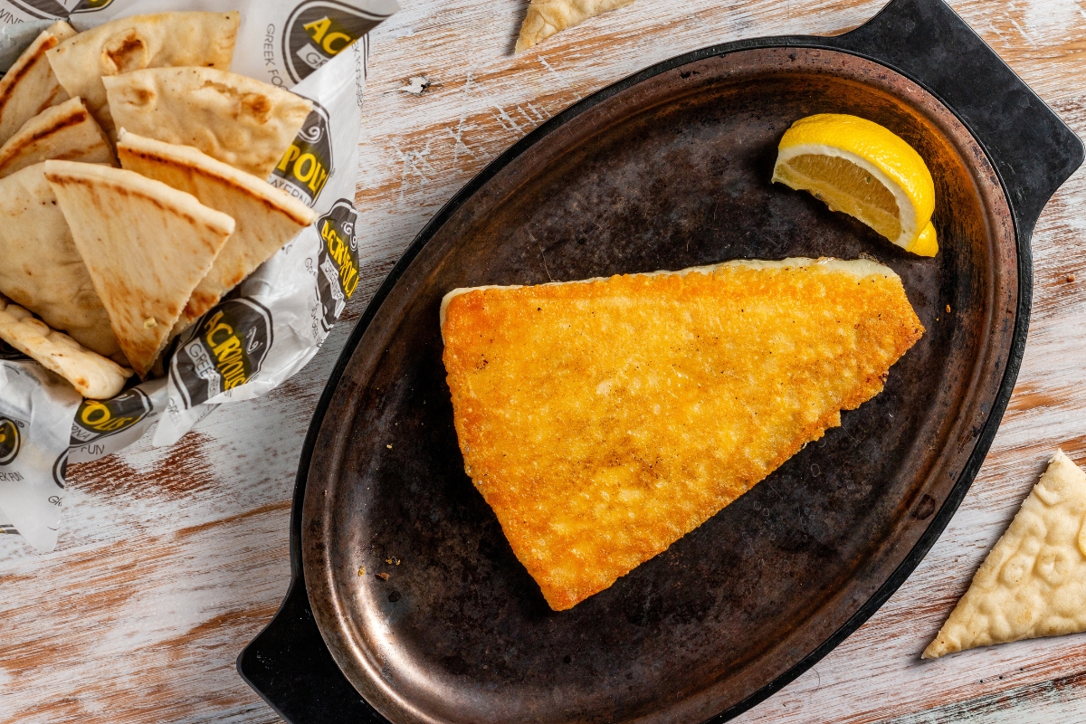 Mushroom Caps stuffed with tirosalata, garlic and herbs, coated with panko bread crumbs, fried until crisp. Served with Acropolis sauce.
