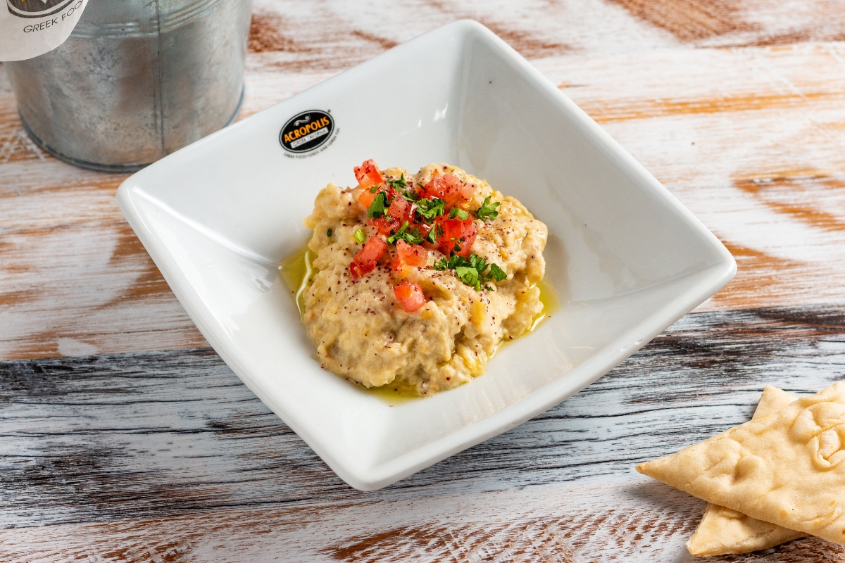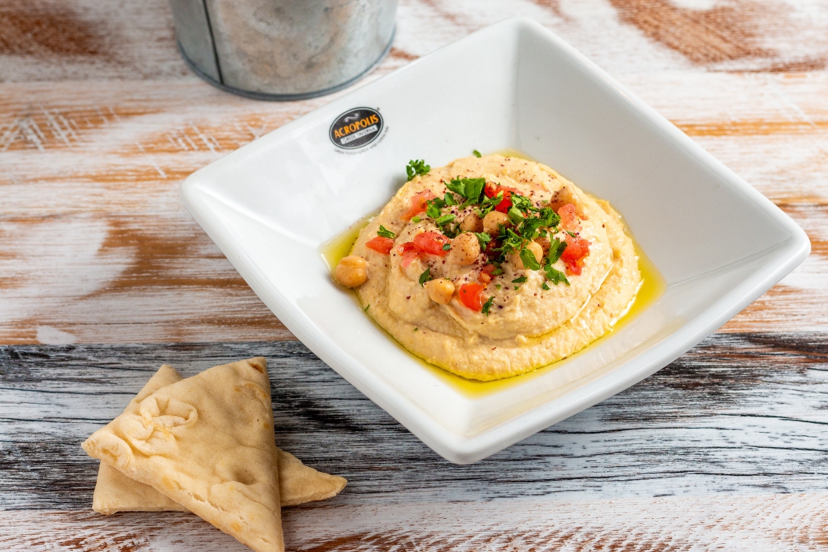 Acropolis chickpea spread made with tahini and topped with extra virgin olive oil and tomato. Served with fresh pita.