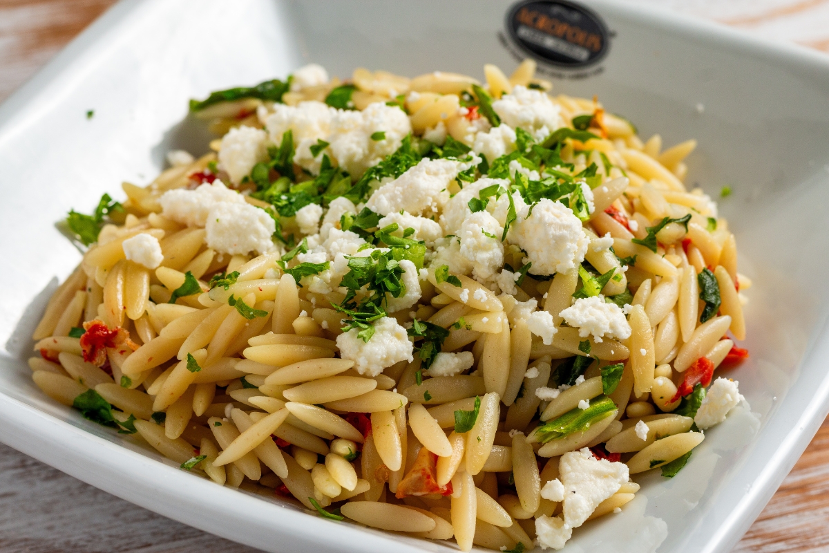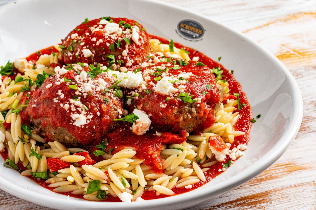 Seasoned grilled ground Angus beef meatballs topped with marinara sauce and feta cheese. Served over mediterranean orzo.
