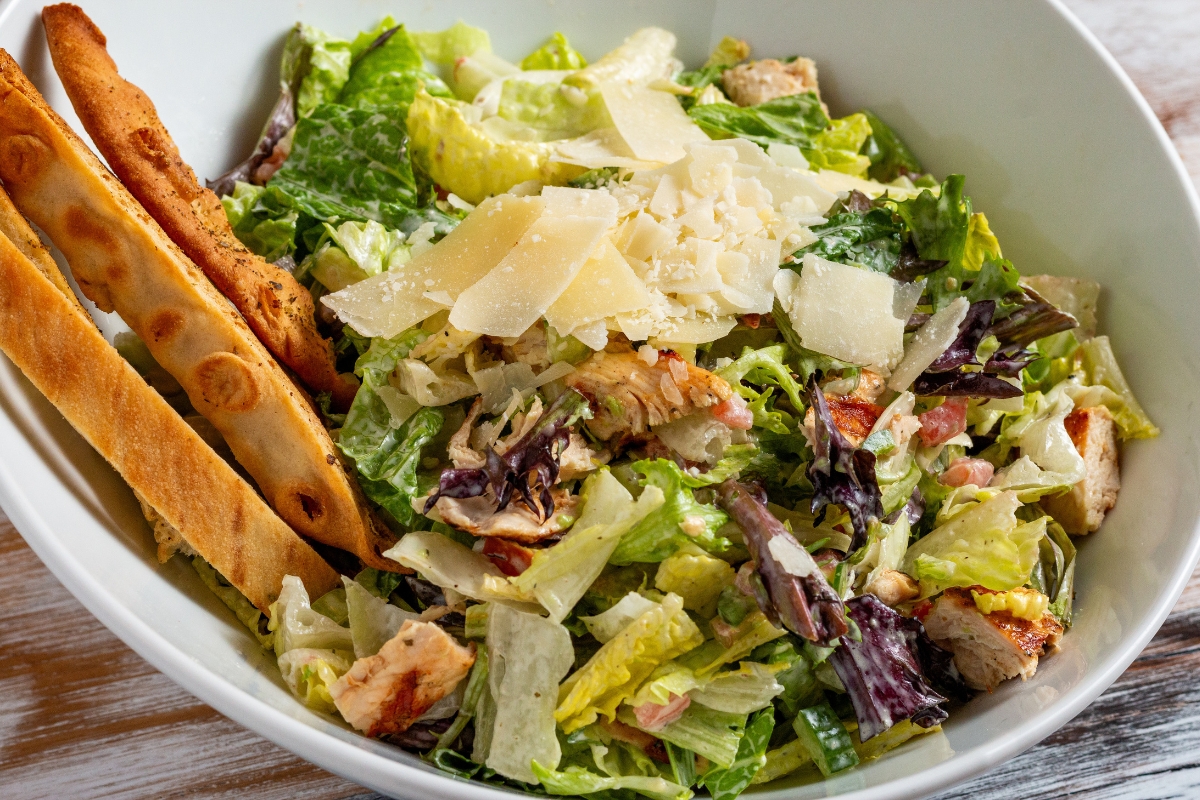 Our signature chopped salad! Lettuce mix, jalapeño, grilled chicken, cucumber, tomato, onion, and avocado chopped and tossed in our garlic aioli dressing. Topped with shaved parmesan cheese and toasted pita strips.