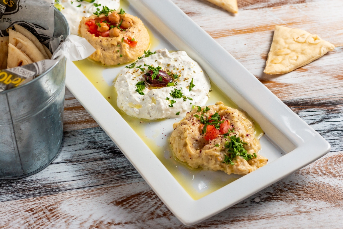 Hummus, Tirosalata, Tzatziki, and Baba Ganouj. Served with fresh pita.