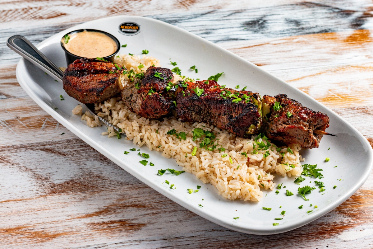 Fresh filet mignon with green peppers, onions, and cherry tomatoes served over Greek rice.