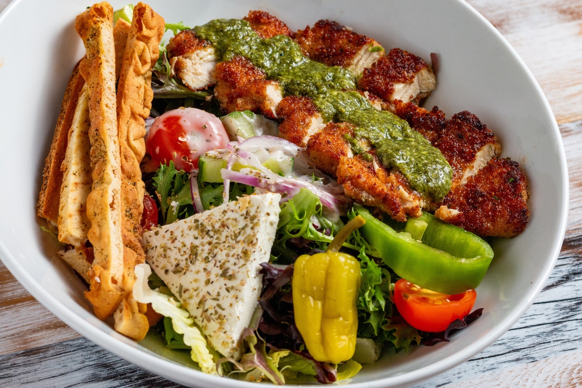 Lightly breaded chicken breast over lettuce mix, tomato, onion, kalamata olives, pepperoncini. Topped with pesto, feta cheese, and toasted pita strips. Served with Acropolis homemade Greek dressing.
