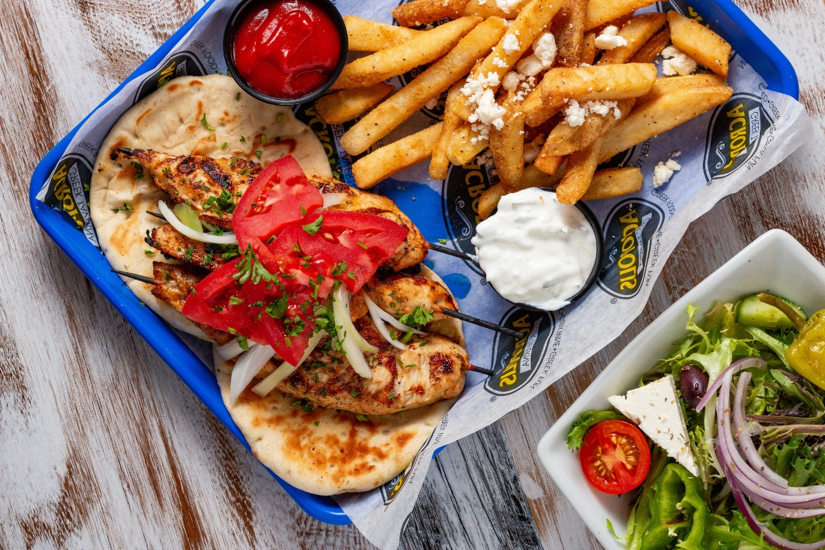 Char grilled chicken tenderloin skewers over pita. Served with Greek fries and side Greek salad.