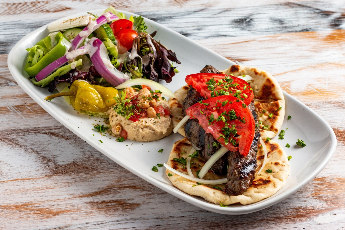 Charbroiled angus ground beef minced with mediterranean seasoning. Served with side Greek salad & hummus.