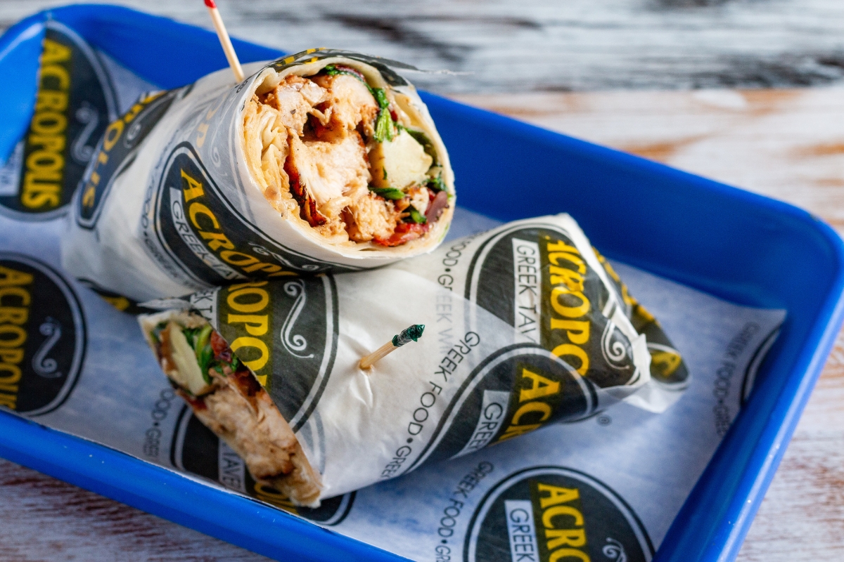 Sliced chicken breast, spinach, olives, sun dried tomatoes, artichokes and feta cheese with pesto, garlic dill aioli, and wrapped in a tortilla.