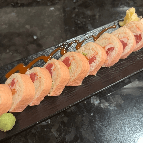 Pink soy paper wrap with fresh tuna, fresh salmon, imitation krab, smelt roe, and avocado.