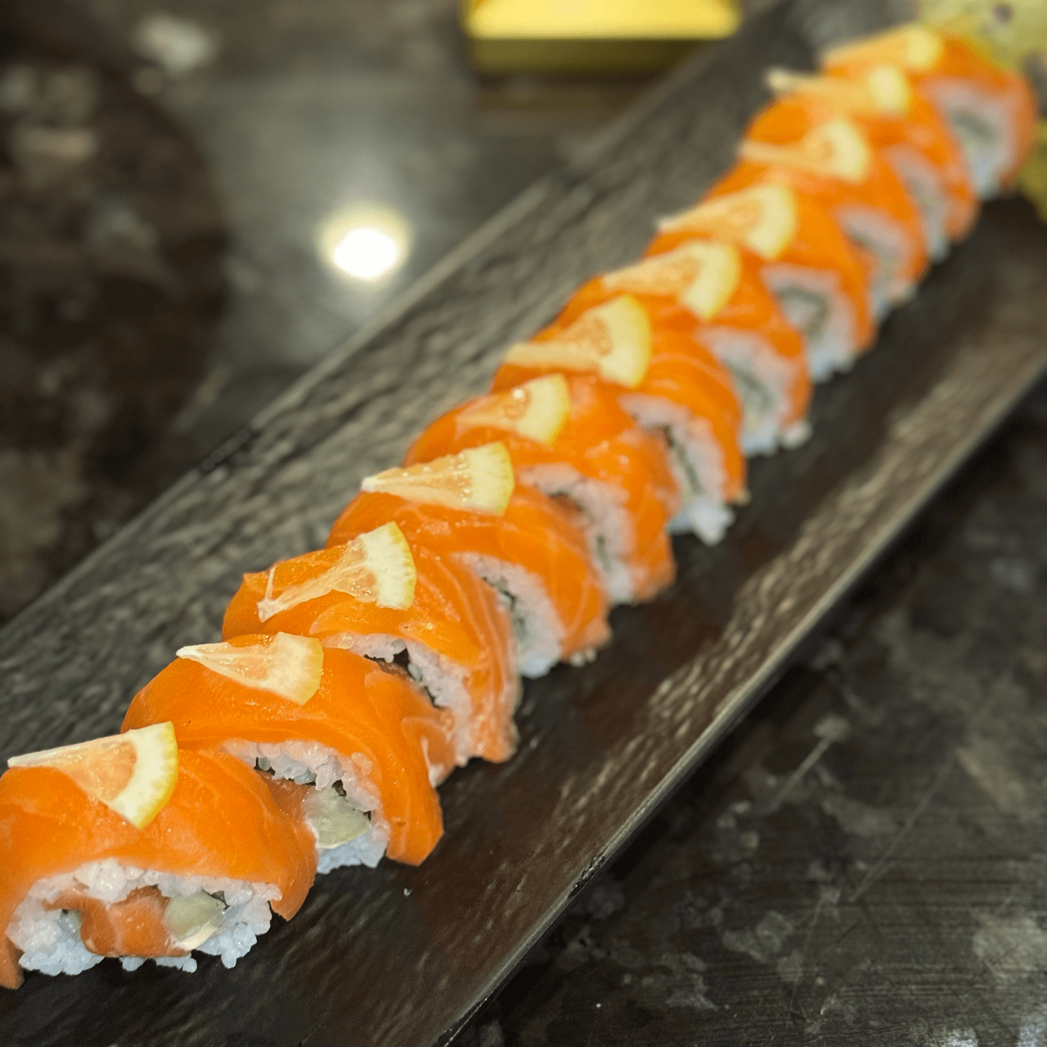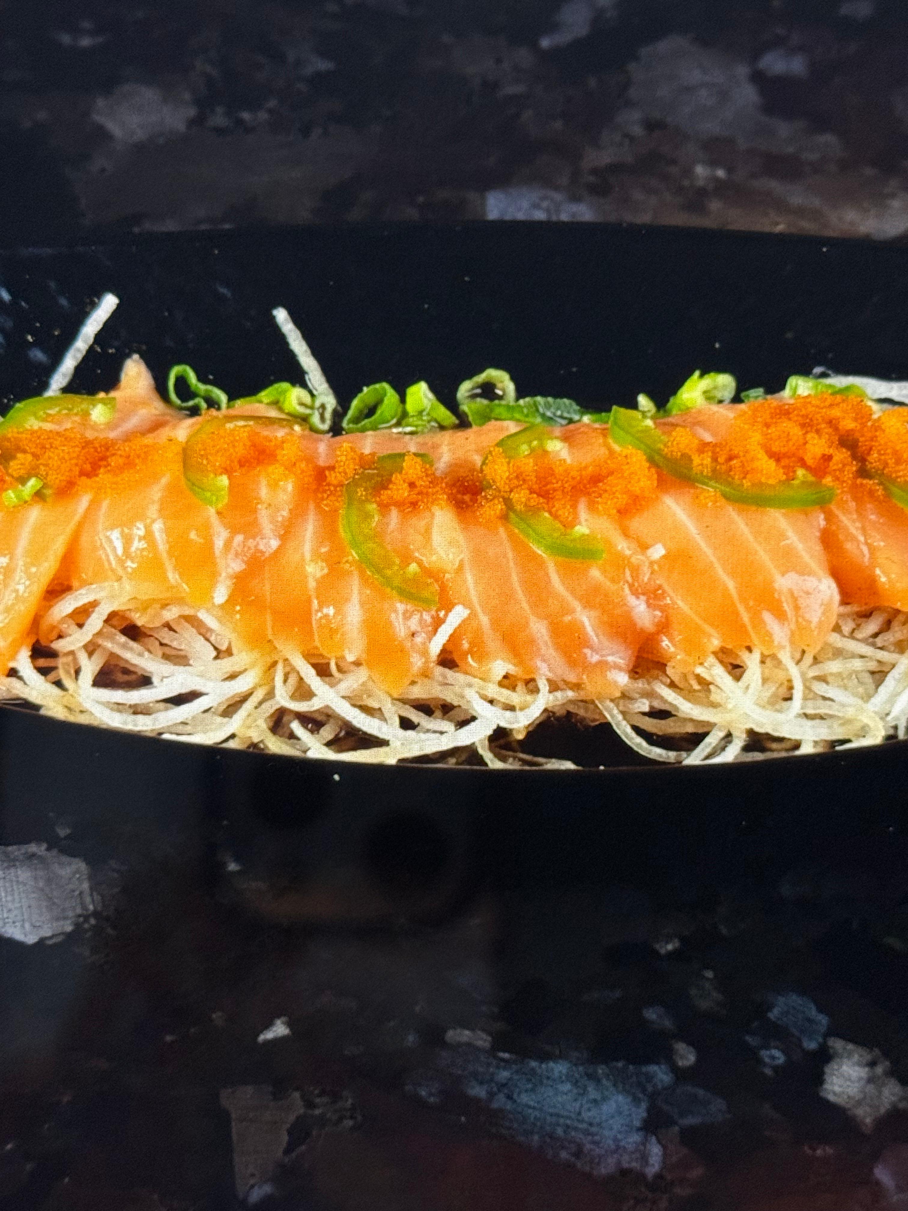 Baked salmon mixed with spicy mayo, tempura flakes, scallions, and smelt roll rolled into a sushi roll and topped with sliced fresh salmon.