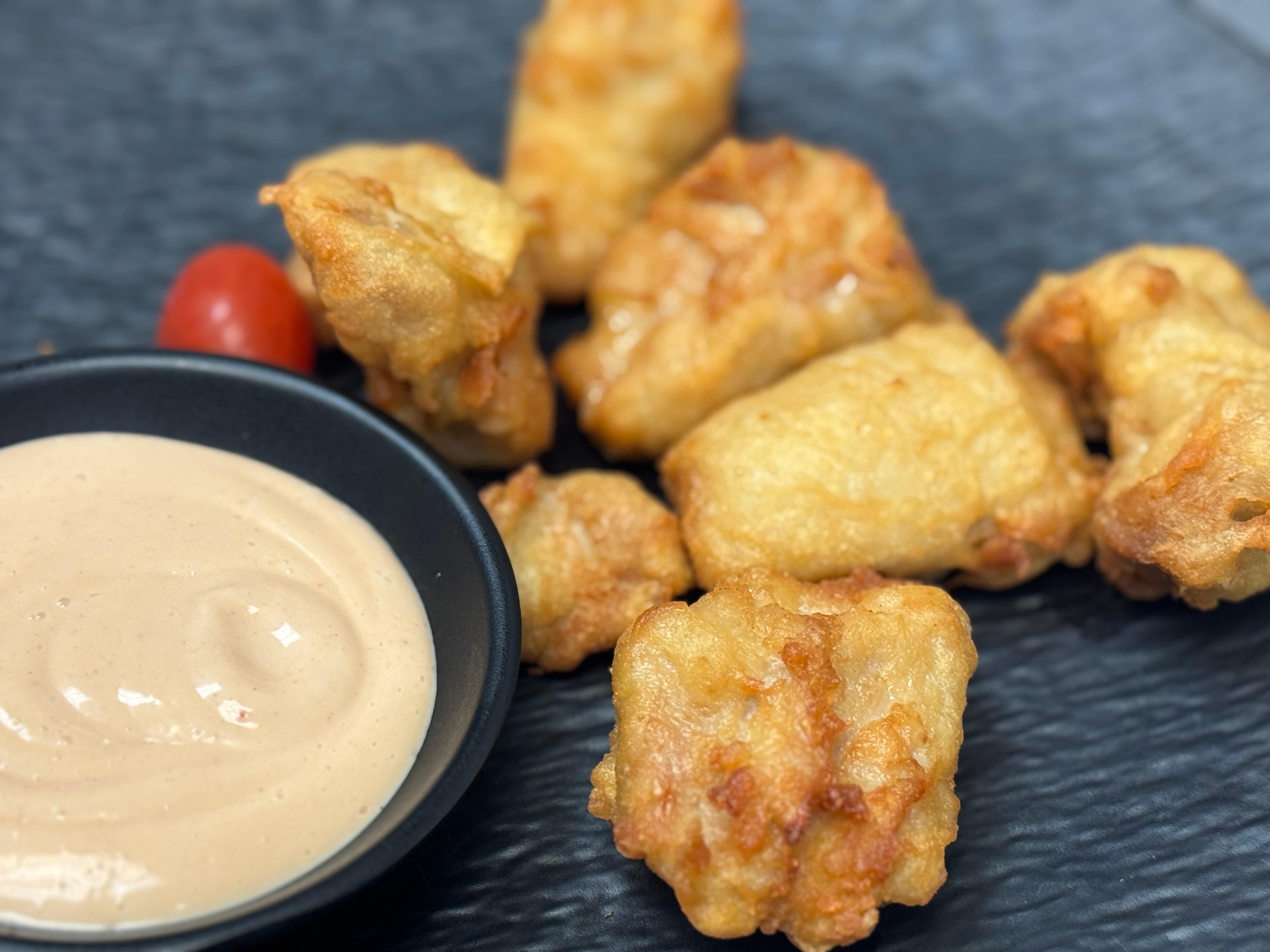 Two pieces of tempura chicken, broccoli, carrot, and onion served with a light housemade tempura sauce.