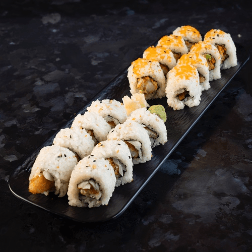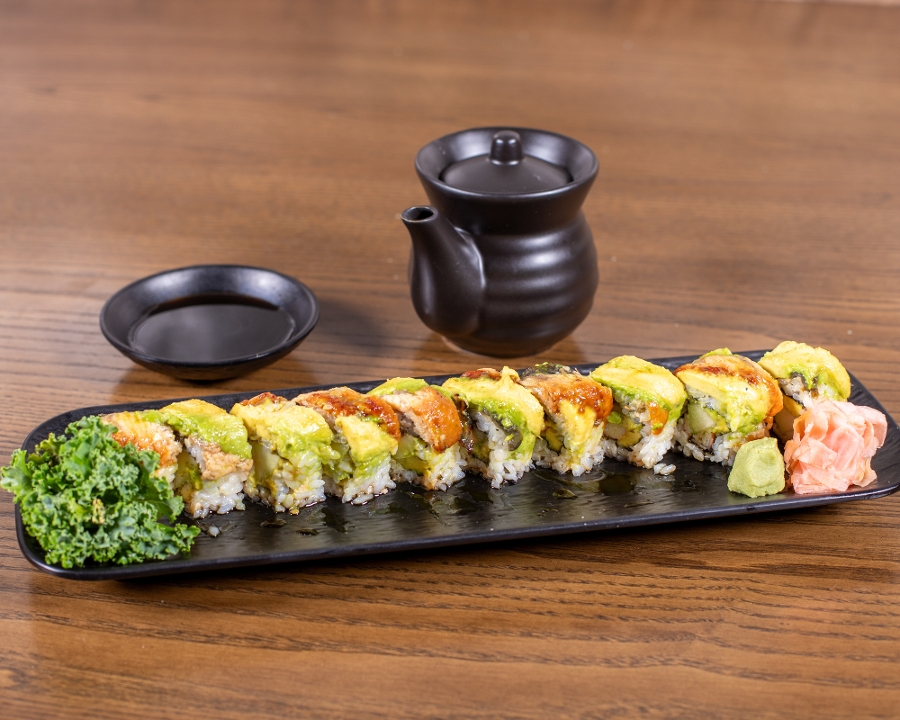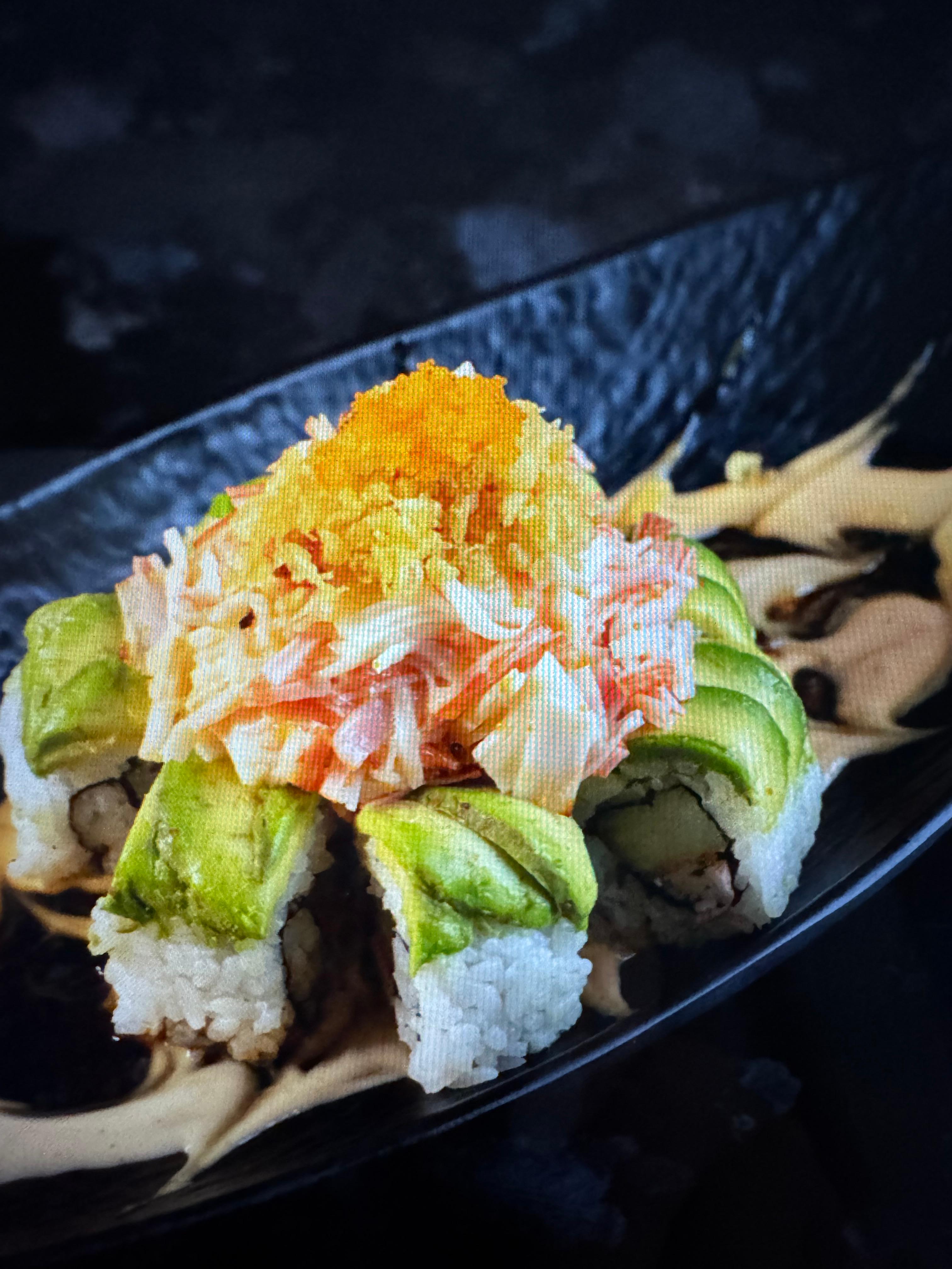 Baked fish mixed with smelt roe, spicy mayo, tempura flakes rolled into a sushi roll and topped with sliced avocado and housemade eel sauce.