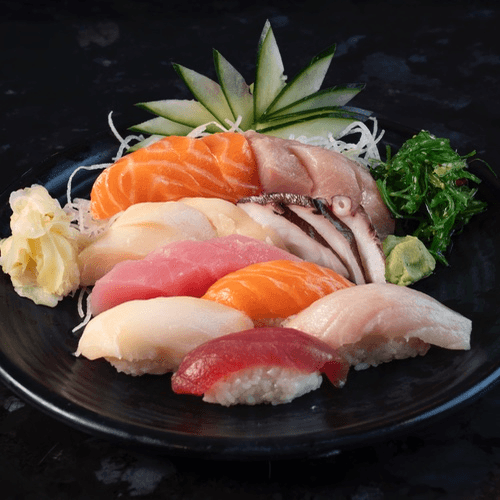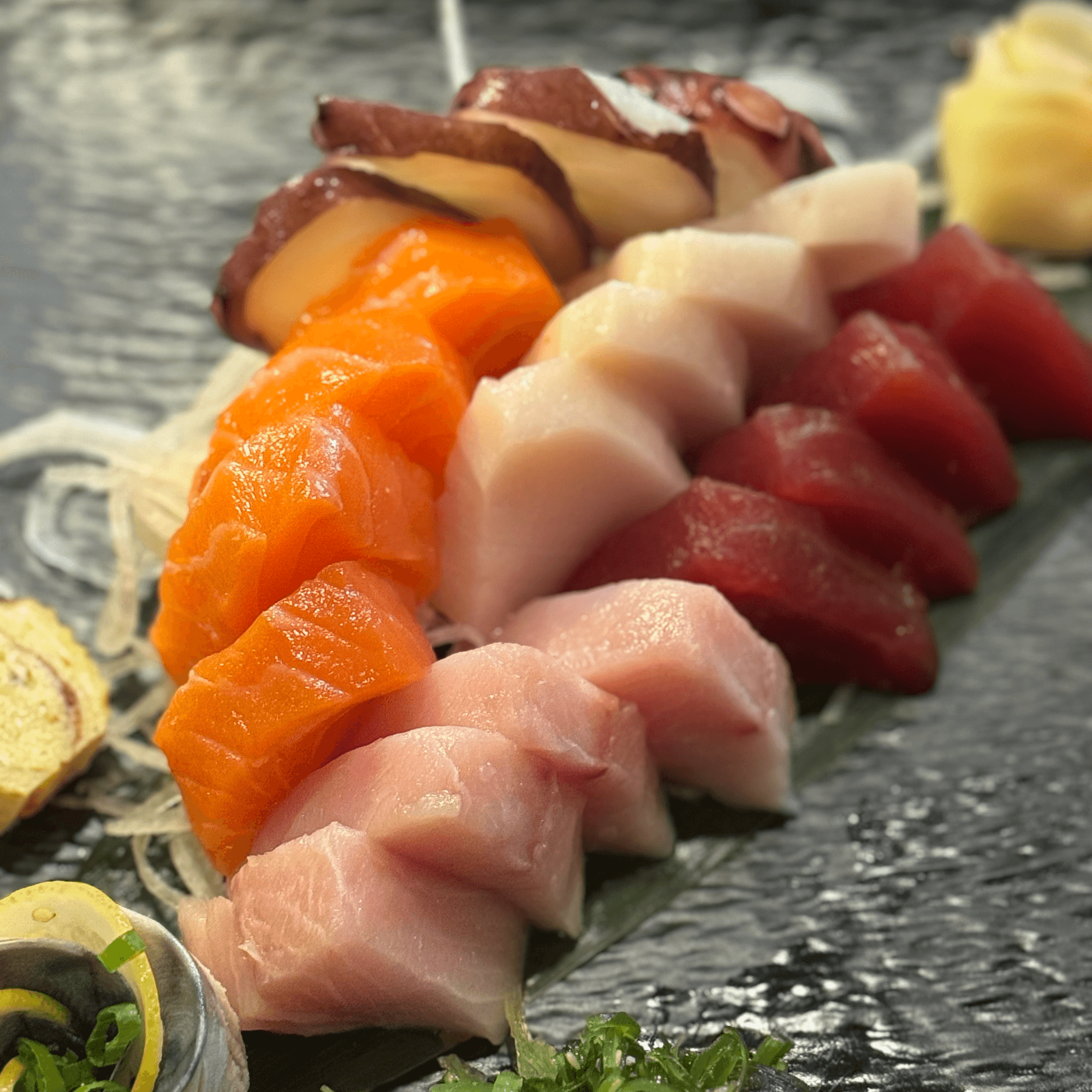 3 pieces of tuna, salmon, yellowtail, white tuna, and octopus (15 pieces total of sashimi) served with steamed shrimp, krab special, and sushi egg.