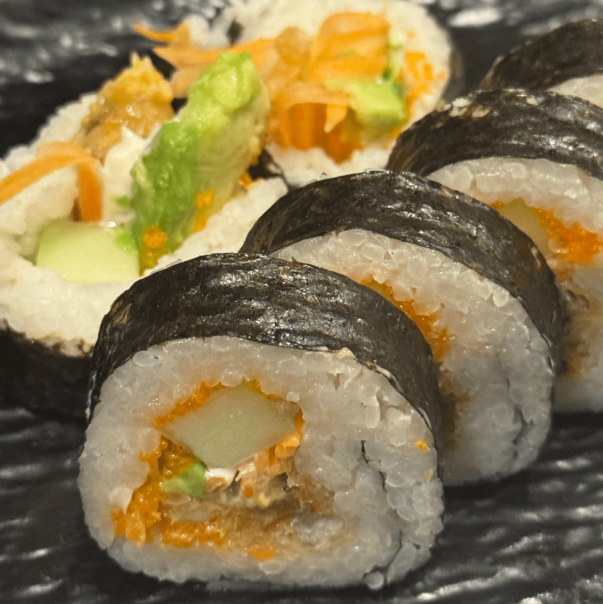 Fried soft shell crab, mayo, carrot, cucumber, avocado, and smelt roe.