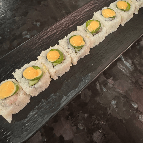 Cucumber and fresh yellowtail topped with yellowtail ,sliced jalapeño and spicy mayo.