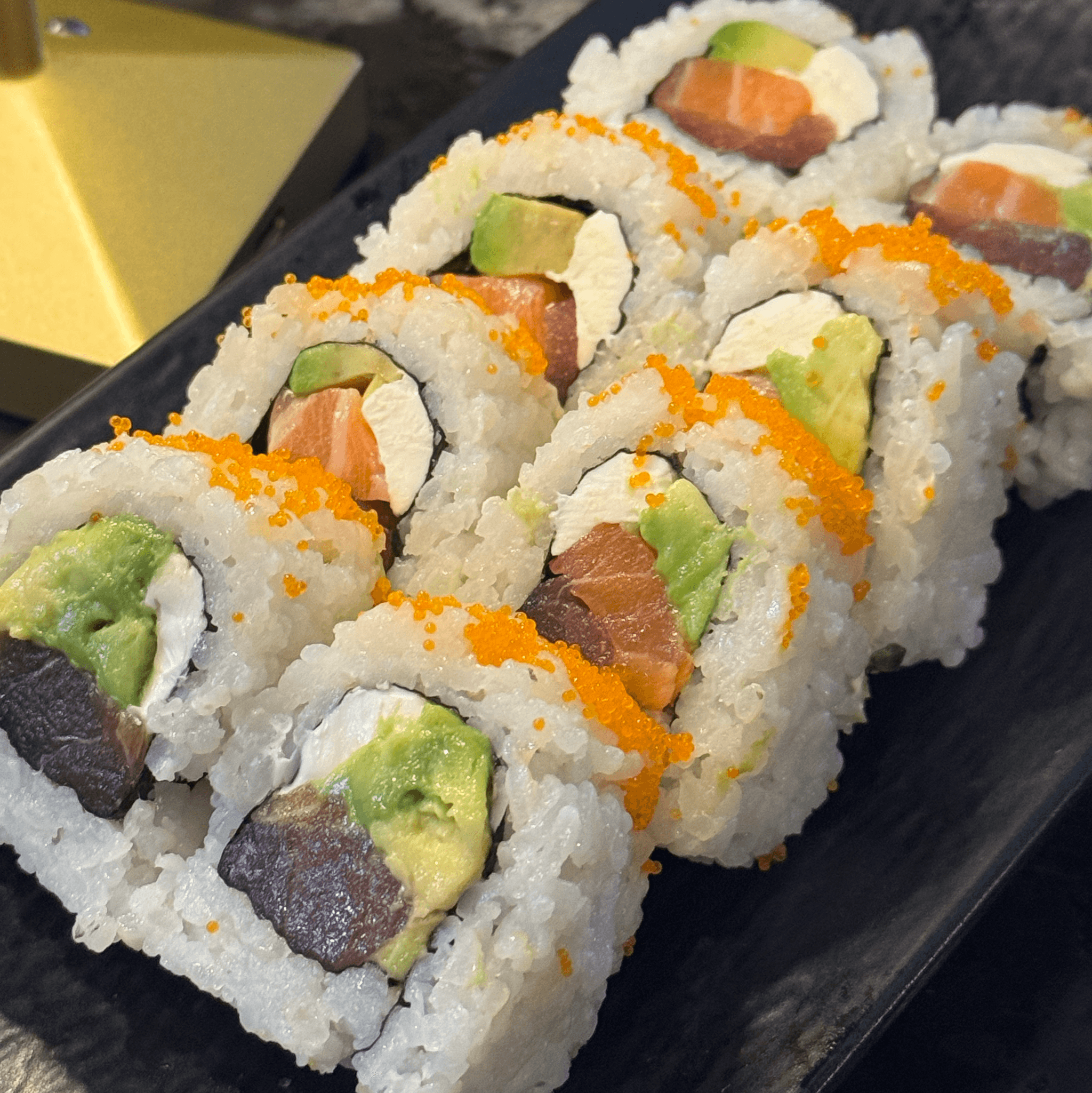 California roll (imitation krab, cucumber, and avocado) topped with steamed shrimp, avocado, fresh tuna, fresh salmon, and fresh yellowtail.