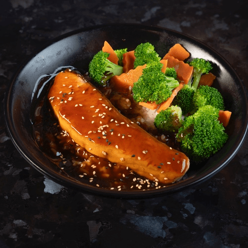 Pan grill chicken or salmon with steam broccoli, carrot serve with steam rice