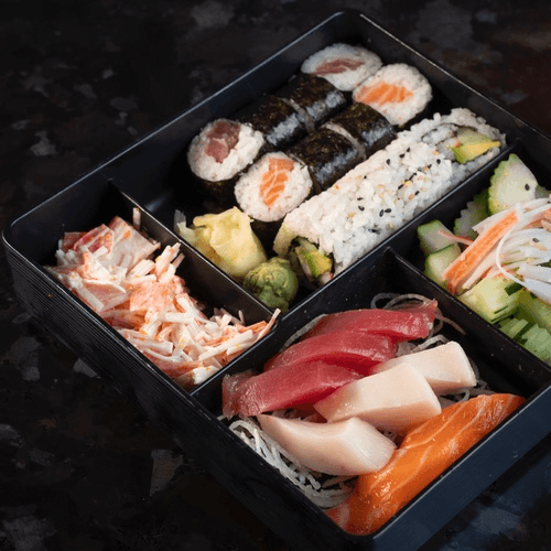 4 pieces of tuna, salmon, yellowtail, white tuna, and octopus (totaling in 20 pieces of sashimi) served with shrimp, sushi egg, krab special, seaweed salad, and steamed rice.