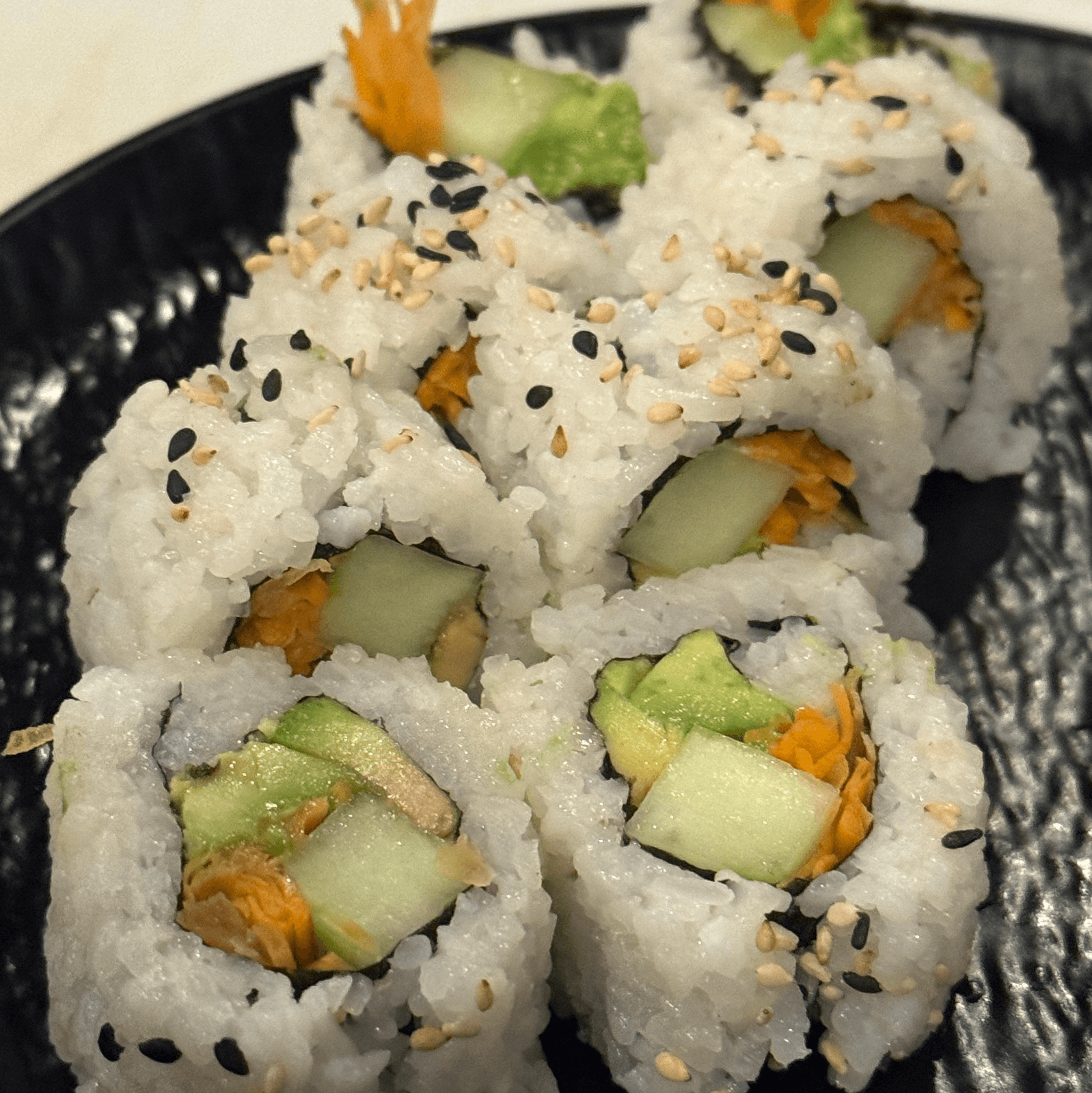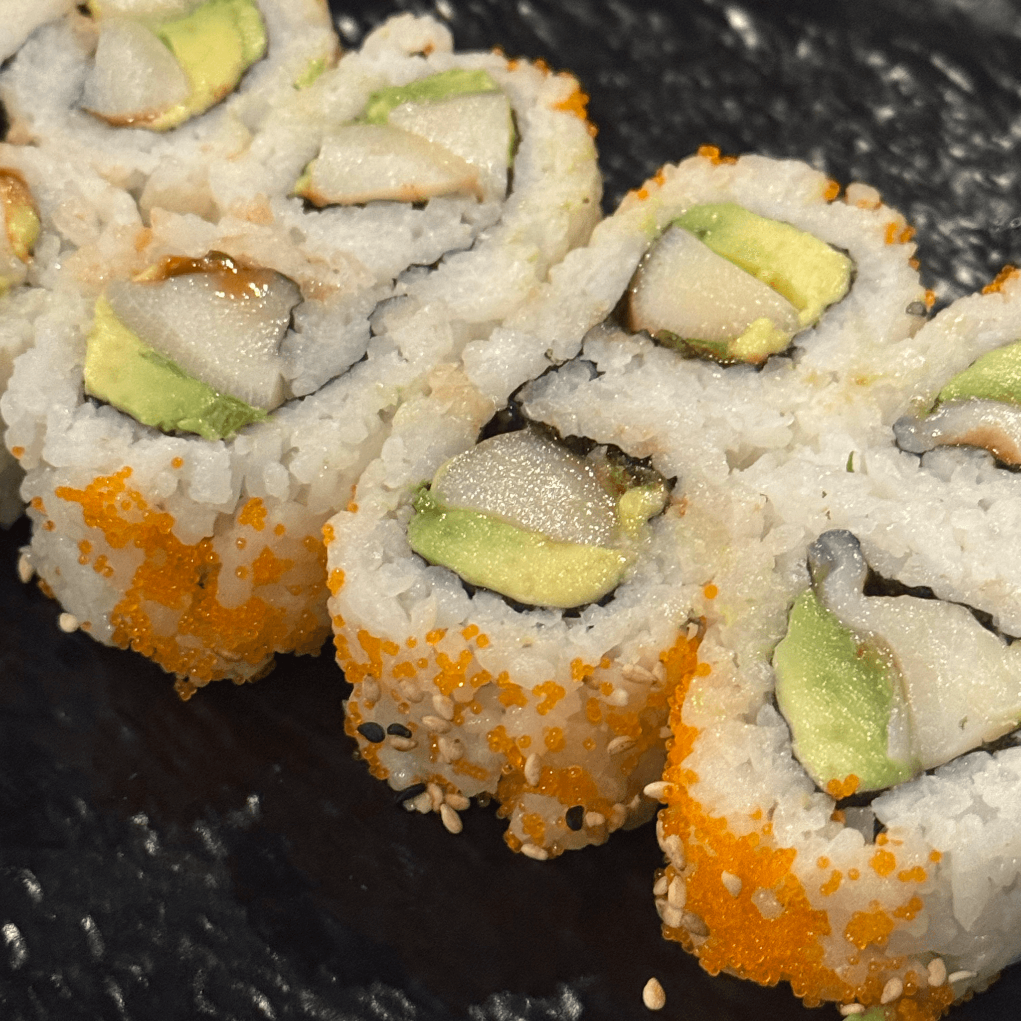 California roll (imitation krab, cucumber, and avocado) topped with sliced BBQ eel and avocado.